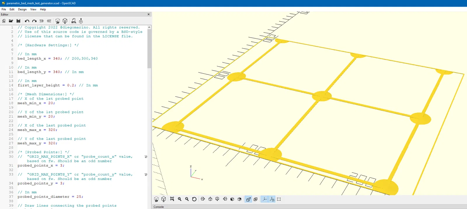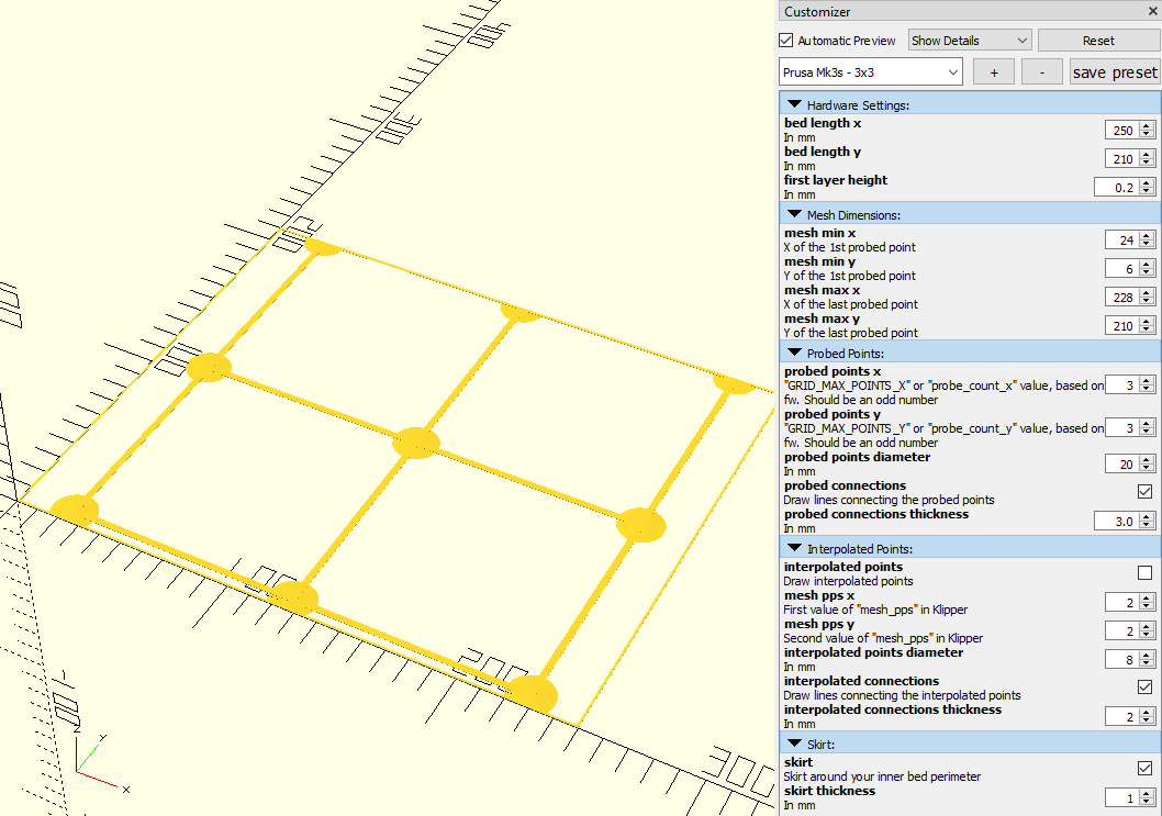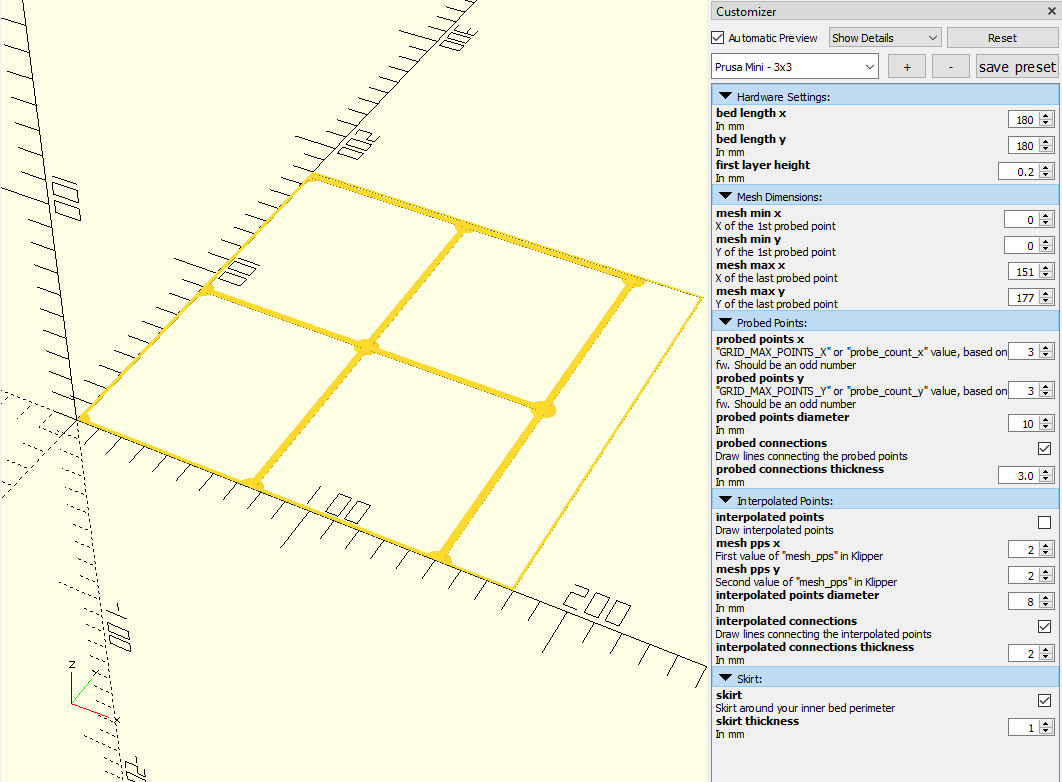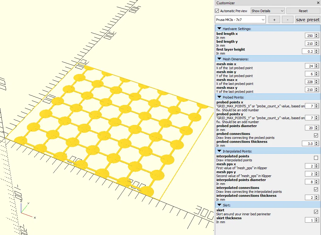 Tệp SCAD giúp bạn tạo các vật thể in trên các điểm đã dò và nội suy trên bàn in. Thích hợp cho việc kiểm tra và cân chỉnh bàn in trên các máy như Prusa Mini, MK3s và Voron2.