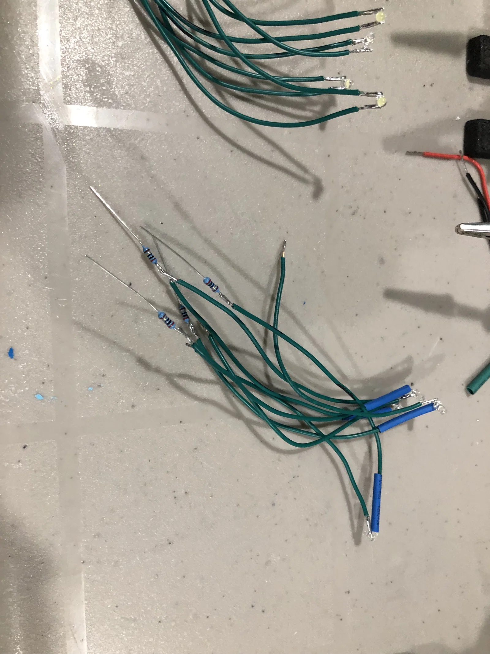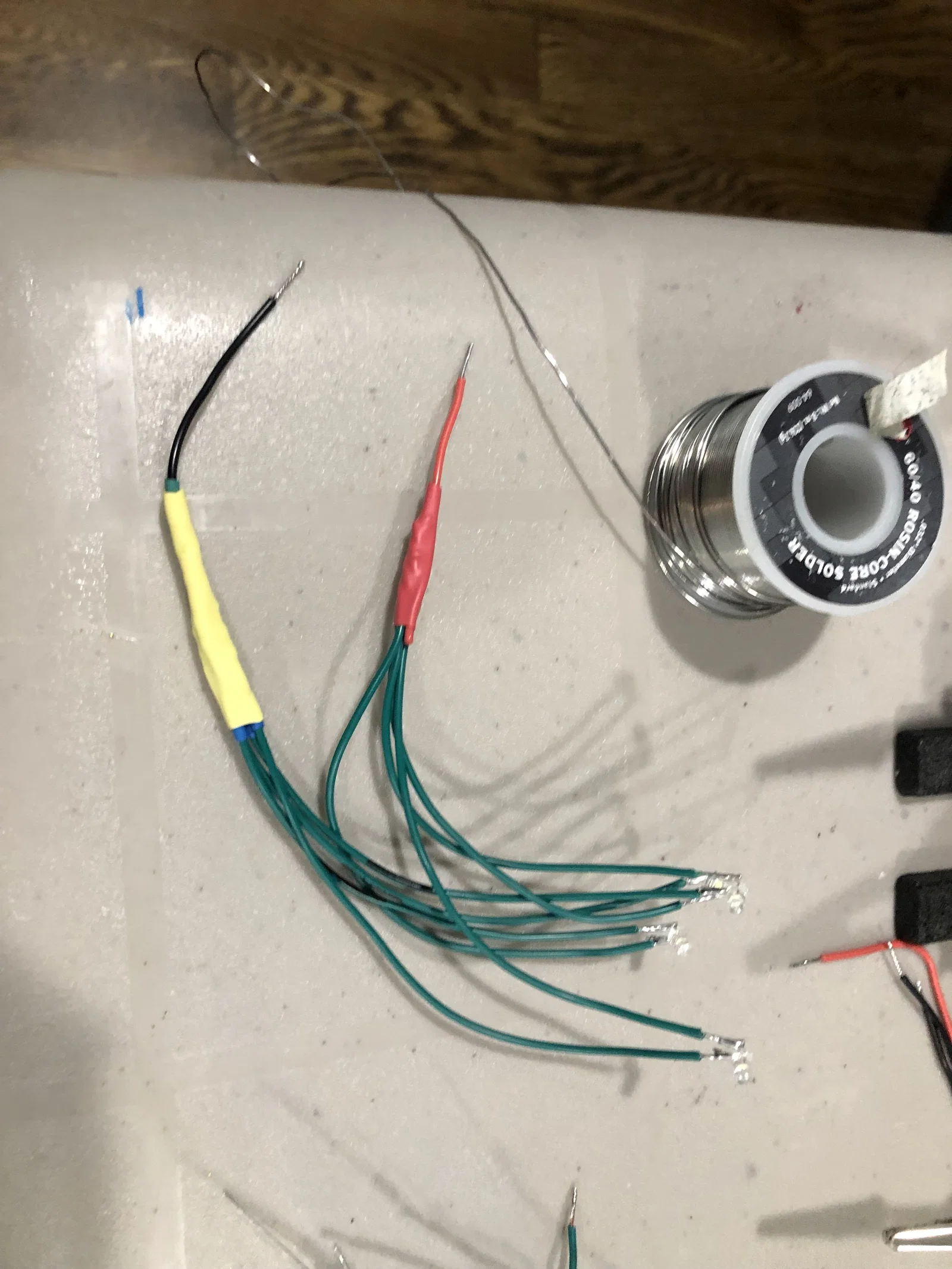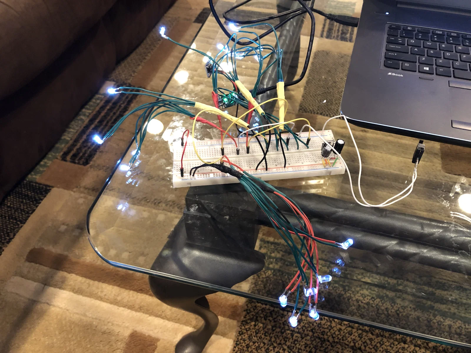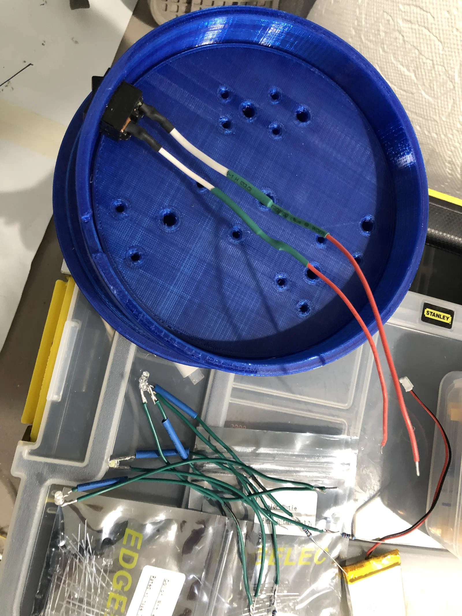 Dây điện hơi khó khăn để mọi thứ vừa vặn, với rất nhiều đèn LED trong không gian nhỏ như vậy. Lắp vừa 12 đèn LED trắng 3mm và 6 đèn LED trắng 5mm, một mạch trinket và pin lipo vào bên trong. Nắp dưới có chỗ gắn cổng USB sạc pin lipo và nắp trên có khe có thể bẻ ra để lắp công tắc nguồn.