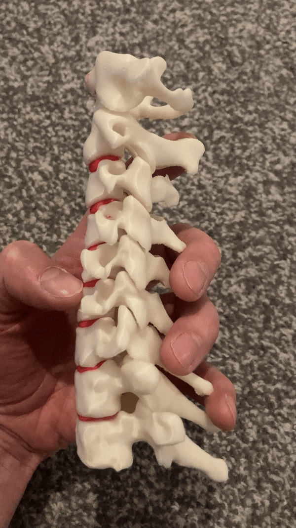 Xương cổ sống dễ in với đĩa đệm. Không cần bệ lót. Phân đoạn hình ảnh thực hiện trong 3D Slicer. Các tác phẩm 3D khác trong Grasshopper và MeshMixer. Chất liệu in: Prusament PLA Vanilla White, Fiberlogy FiberFlex 40D.
