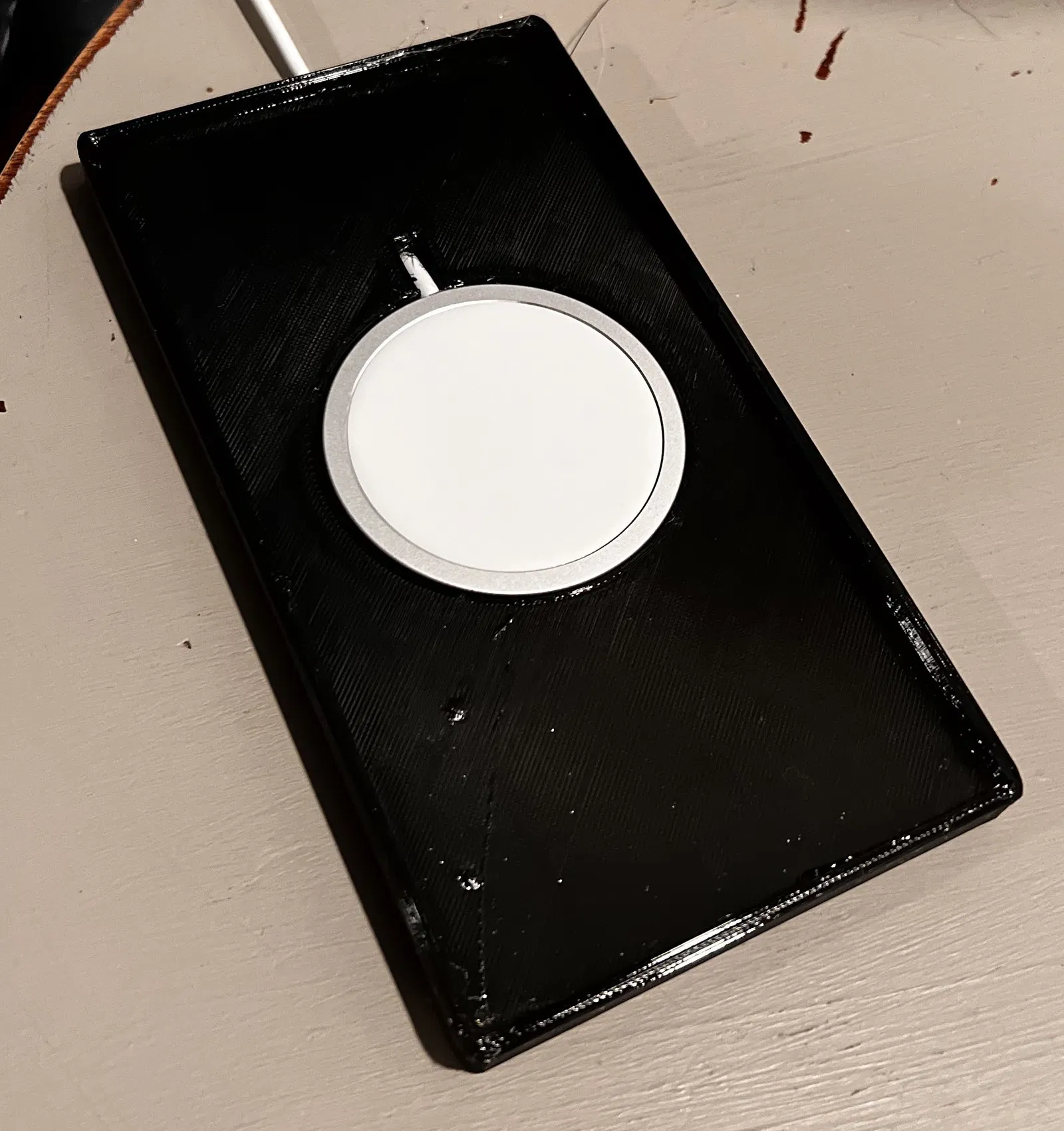 Cái đế phẳng này dành cho iPhone 13 Pro của bạn sạc qua đêm. Tui in bằng TPU để chống rung làm tui thức giấc giữa đêm. Tui cũng in bằng PLA phát quang trong tối để dễ tìm thấy nó trong phòng tối.