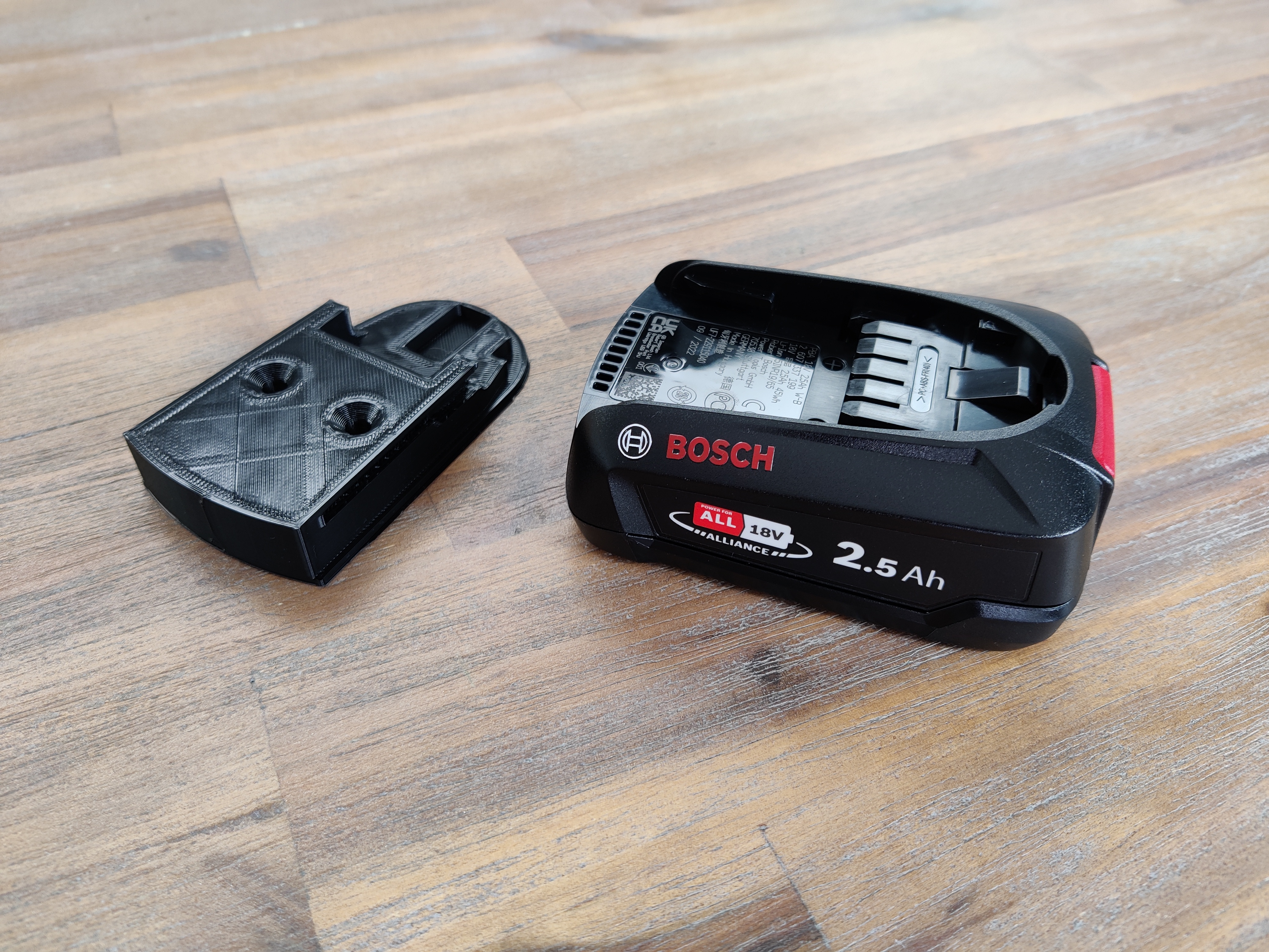 Giá đỡ pin Bosch Green DIY 18V, có lẫy giữ, phù hợp với pin Bosch Green và các pin khác trong liên minh Power For All. Hướng dẫn in chi tiết với các thông số gợi ý cho PLA và tùy chọn supports.