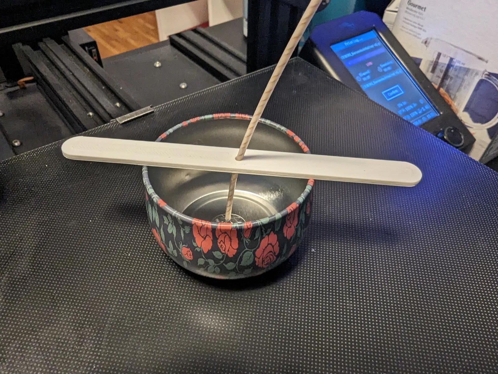 Dụng cụ giữ bấc có thể được đặt trên hũ nến trong quá trình rót. Bấc nến nên được luồn qua lỗ ở giữa.