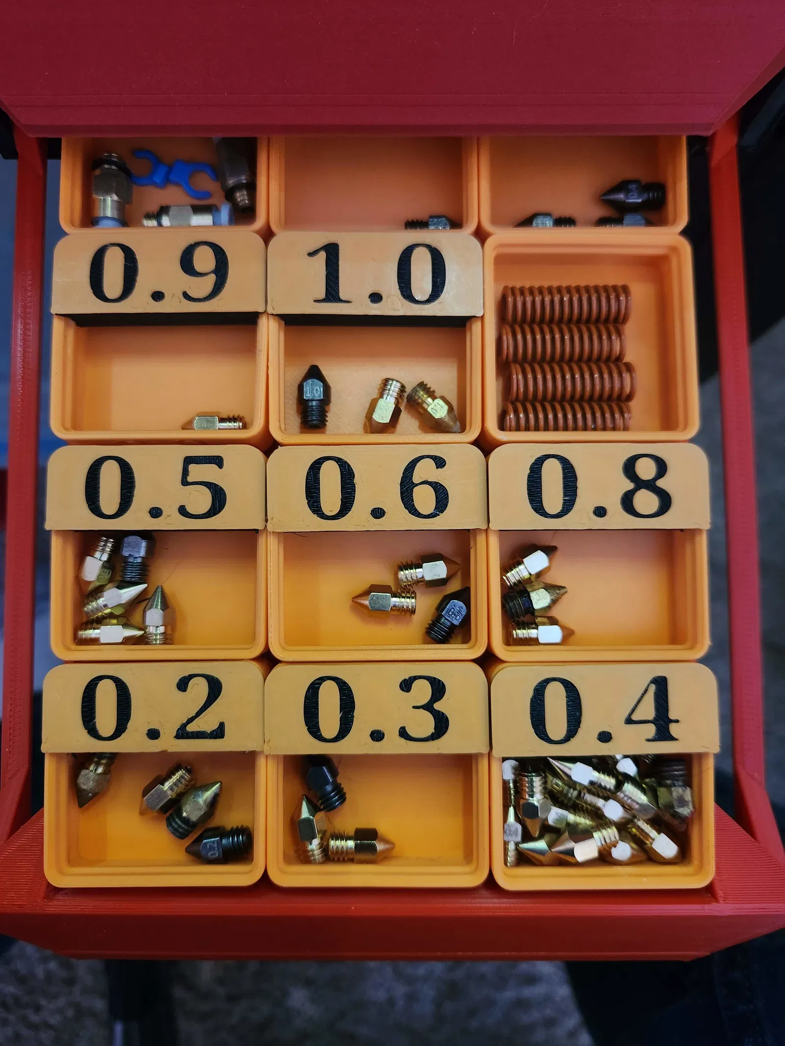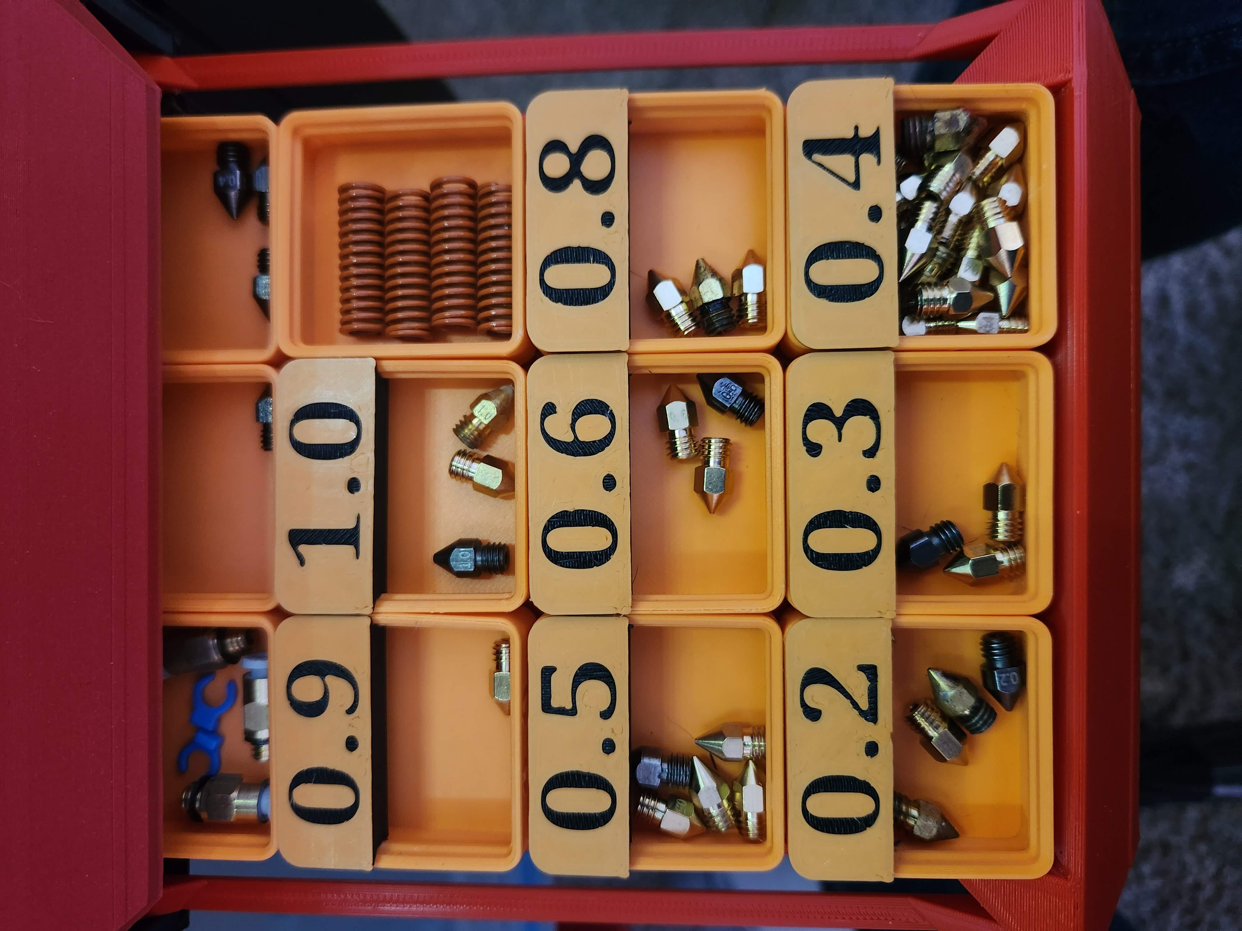 Tui có in mấy cái hộp Gridfinity để xài với bàn Ikea Lack đó. Tui dùng mấy cái hộp nhỏ để đựng mấy cái đầu phun (nozzle) với kích cỡ khác nhau. Tui tìm cách dán nhãn mấy cái hộp này để nhìn từ trên xuống là biết đựng đầu phun gì, thì tui tìm được cái Removable Gridfinity Labels. Tui quyết định sửa lại nó để tui có thể in kích cỡ đầu phun lên cái nhãn luôn. Chữ được khắc lõm xuống 0.4mm; nếu bạn in ở độ cao lớp là 0.2mm thì có thể đổi lớp để chữ rõ hơn nhiều.