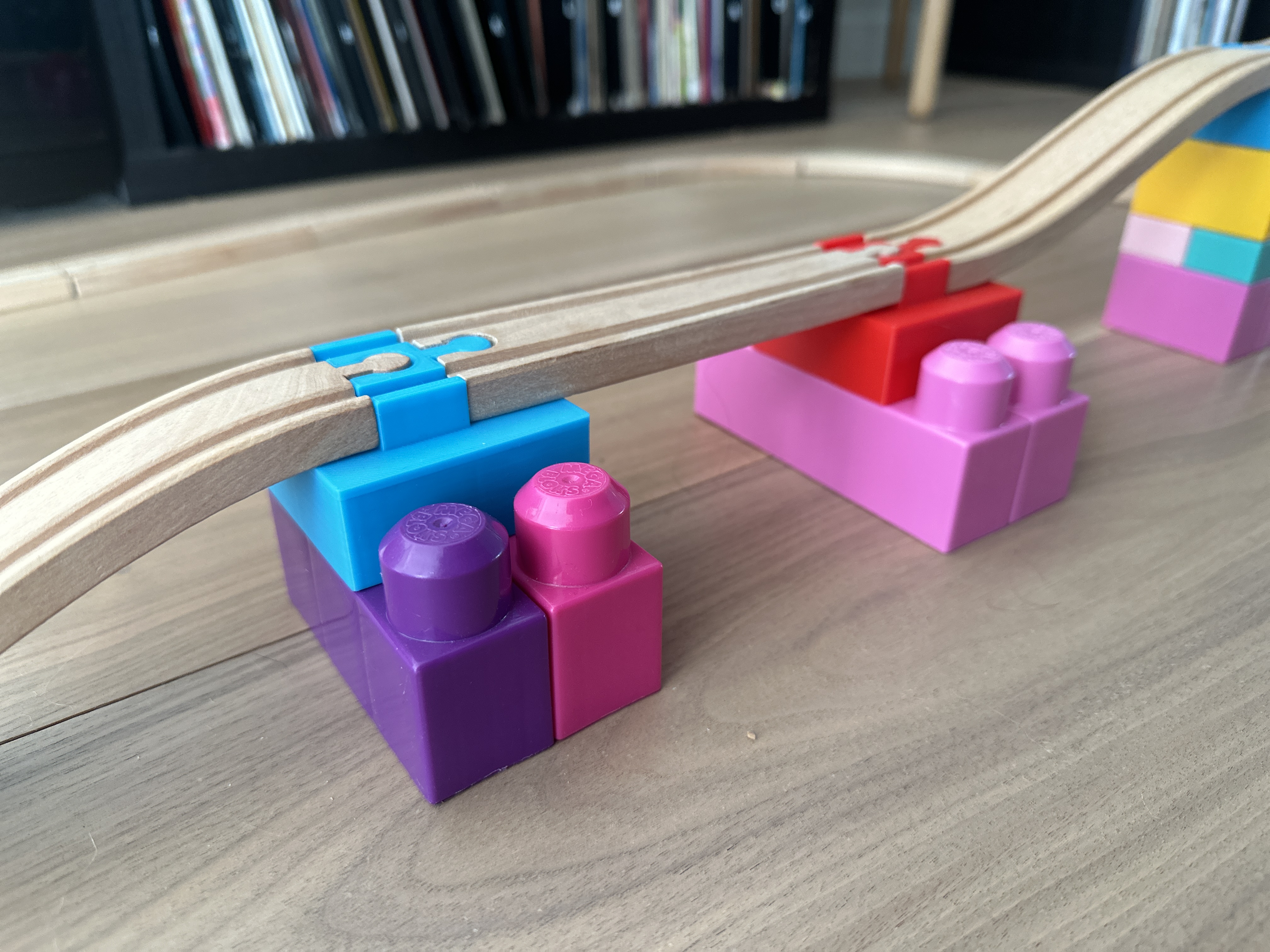 Bộ đế Mega Bloks giúp bạn xây cầu đường ray tàu hỏa Brio siêu to khổng lồ. Bản cập nhật V3/V4 giúp khắc phục vấn đề đường dốc xuống. Có thêm các mẫu đế nghiêng hỗ trợ đường ray thẳng và đế nối không cần support.