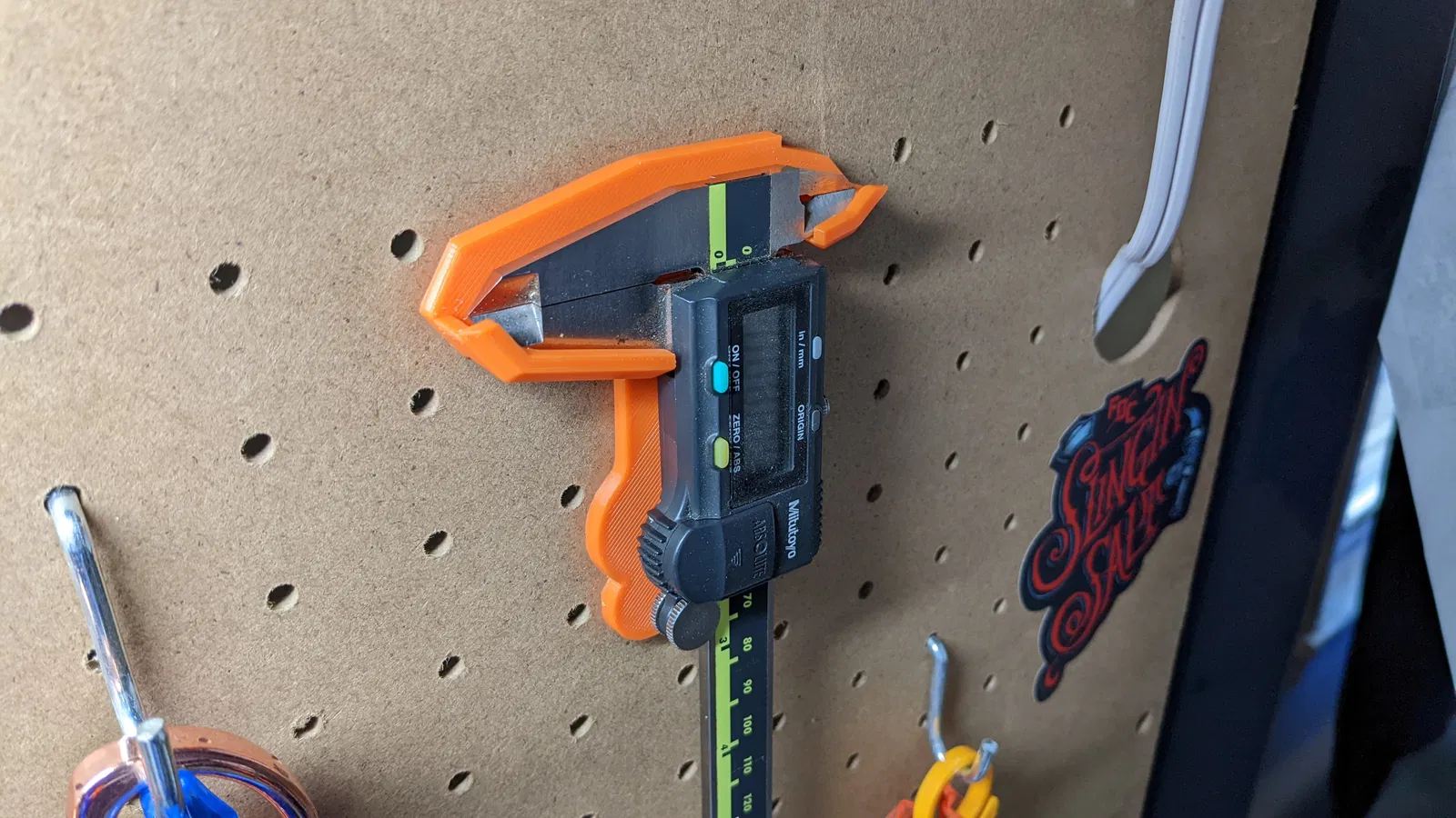 Cái này để treo thước kẹp của bạn lên bảng pegboard. Tôi hay treo thước kẹp Mitutoyo Digital bằng cái này, nhưng mà chắc là xài được cho nhiều loại khác nữa (thước kẹp cơ, loại digital khác…). Nó được in với các lỗ để bắt bu lông và do mỏng nên bạn cần dùng loại đầu chìm để thước kẹp nằm phẳng được. Bạn vẫn có thể treo thước kẹp bằng bu lông/vít đầu tròn nhưng để tránh làm trầy xước mặt sau của dụng cụ đo, hãy kiếm bu lông/vít đầu chìm nha. Nó được in với các phần nhô ra để giữ thước kẹp ở đúng vị trí nên tôi phải in có hỗ trợ (supports) nhưng nếu máy in của bạn đã chỉnh ngon lành rồi thì chắc cũng không cần đâu. Tôi làm cái này dựa theo video của bạn u/TheKertMA làm hướng dẫn.