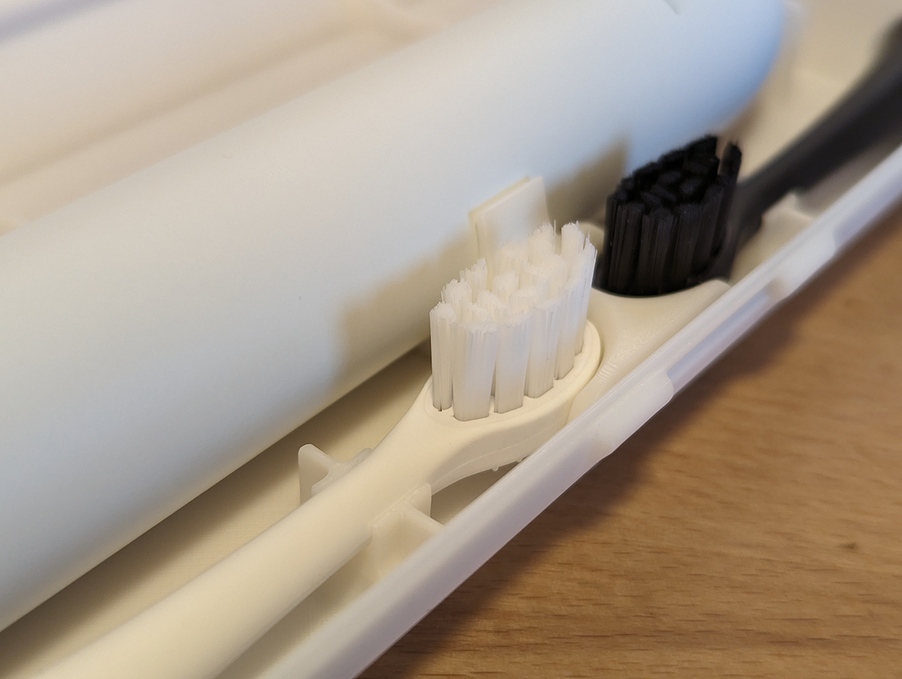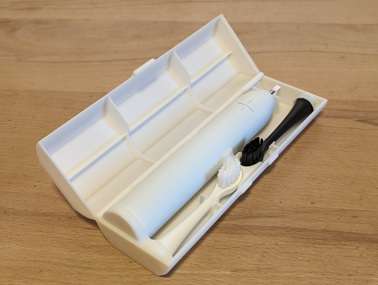 Hộp đựng cứng du lịch in 3D hoàn toàn cho bàn chải đánh răng điện Wondersmile và 2 đầu bàn chải. Không cần nam châm, bu lông, keo hay ốc vít. Chỉ cần các bộ phận in 3D và một ít dây tóc cho bản lề.