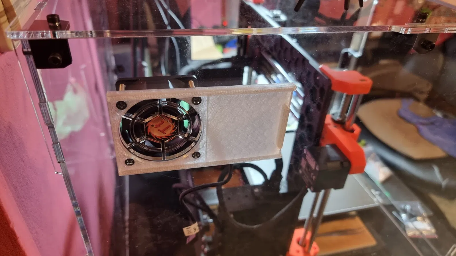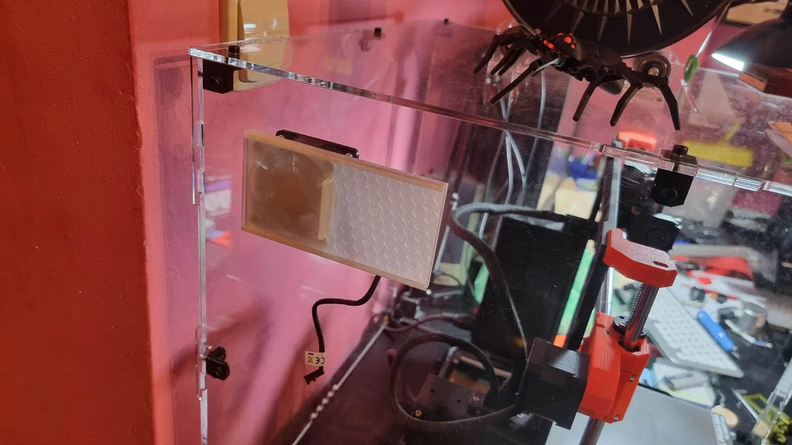 Bộ vỏ máy in của Tukkari TS đơn giản và rẻ tiền. Nó được trang bị lỗ thông gió có nắp đậy. Thật không may, cái nắp này khó tháo ra, vì vậy tôi đã phát minh ra một cái nắp trượt. Khi tôi in vật liệu PLA, tôi mở nắp, khi tôi in ABS chẳng hạn, tôi đóng nó lại để giữ nhiệt trong hộp. Ngoài ra, tôi còn trang bị cho lỗ thông gió từ bên trong một quạt 60 mm, tôi luôn bật nó sau khi mở nắp.