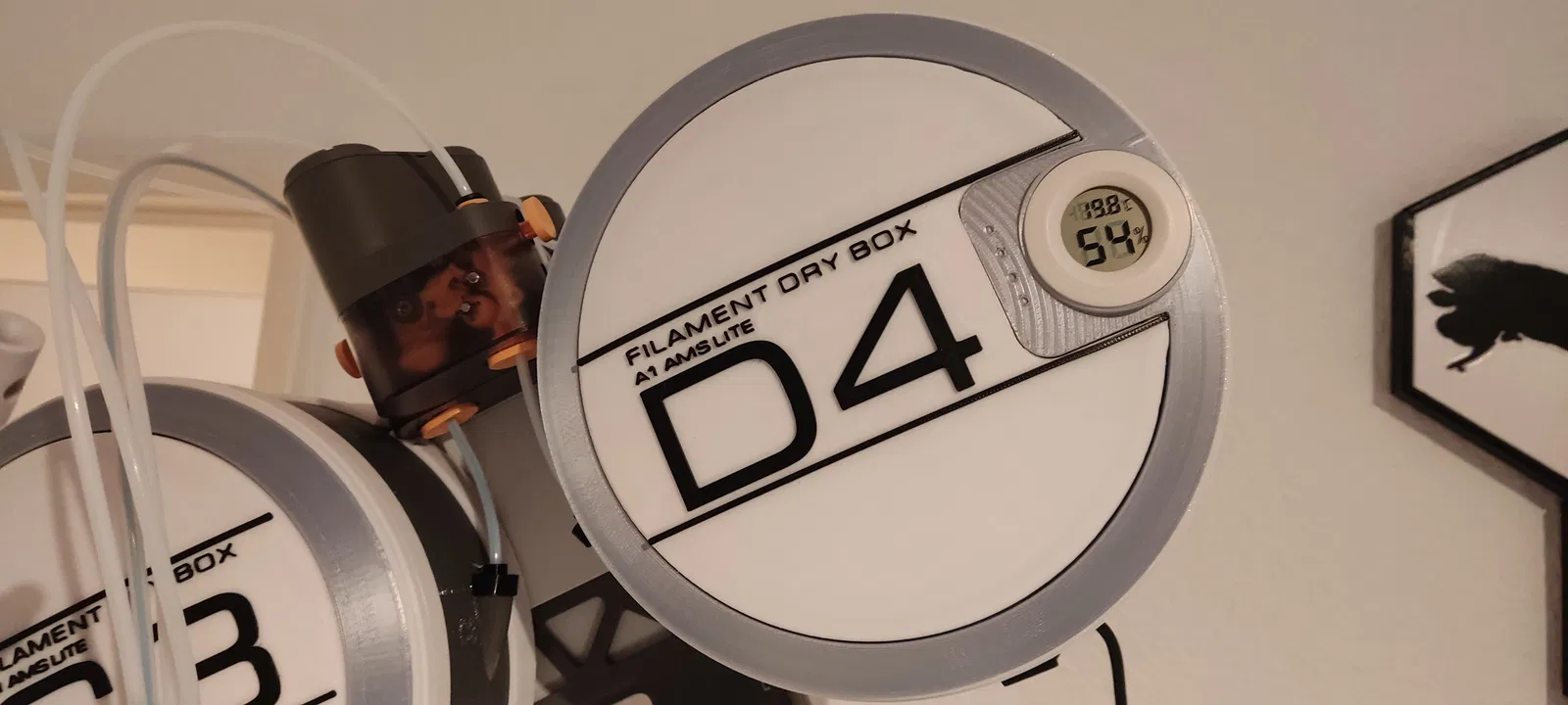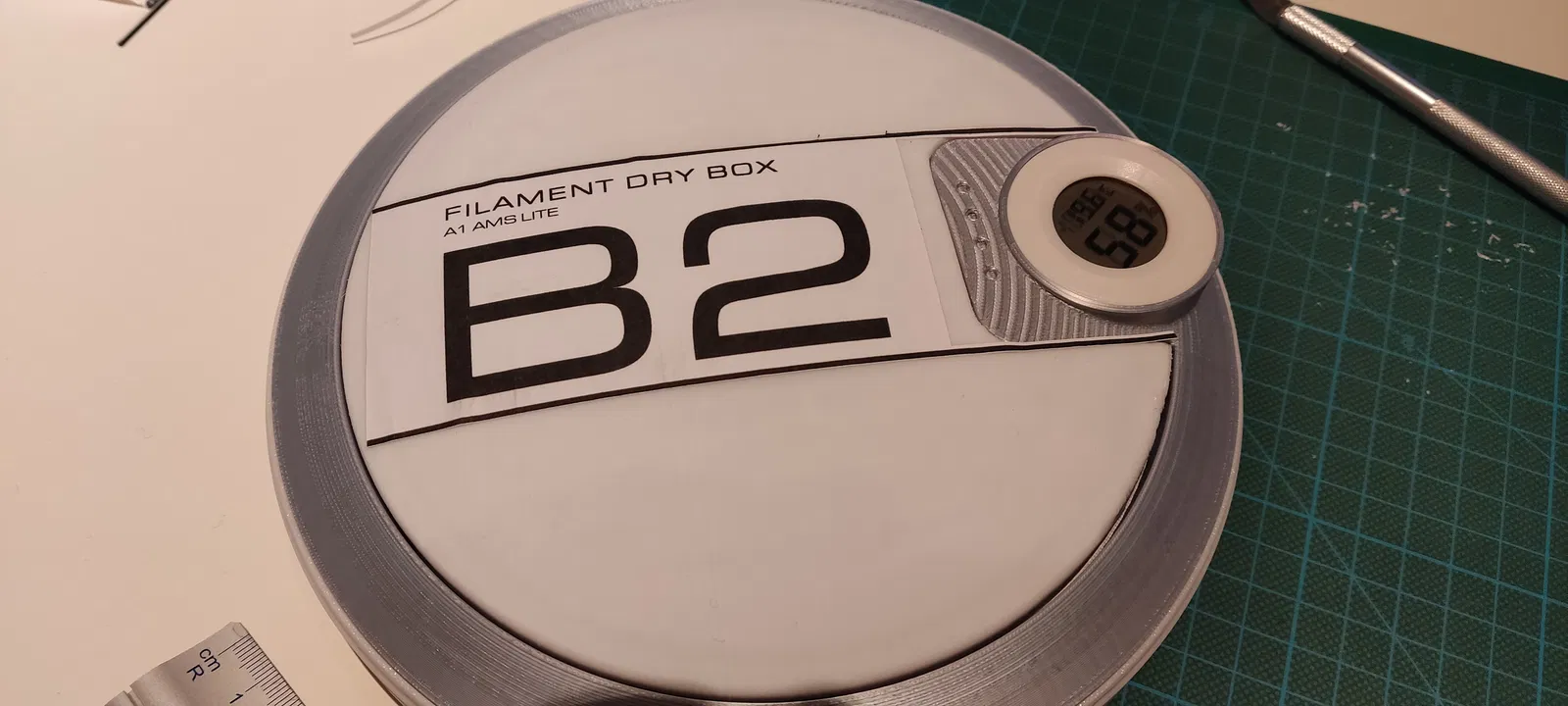 Bản remix hộp sấy AMS Lite A1/A1 Mini có thêm cửa sổ để xem lượng filament còn lại và phần chữ được bổ sung (in giấy hoặc in 3D). Hướng dẫn chi tiết cách lắp đặt và vật liệu cần thiết. File tương thích Bambu Studio.