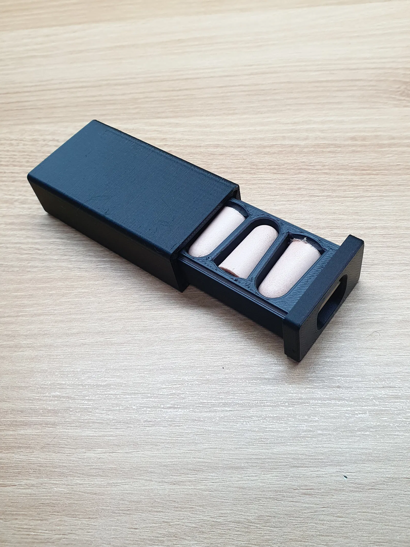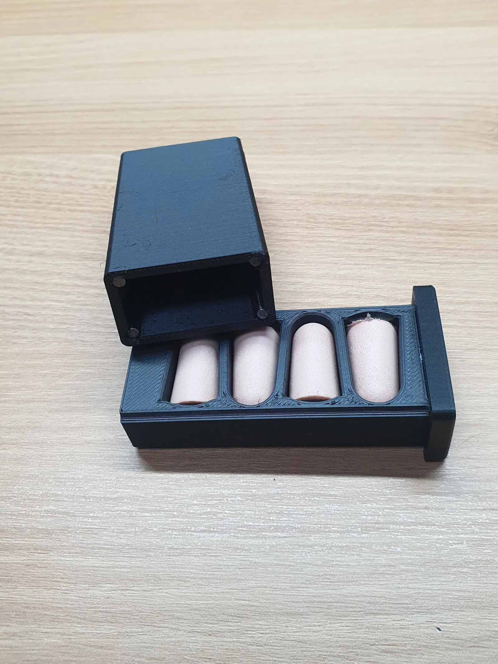 Hộp đựng 4 nút tai, đóng mở trơn tru. Sản phẩm này cần thanh kim loại để làm ray bên trong và thanh trang trí. Rất tiện lợi để bảo quản nút tai của bạn.