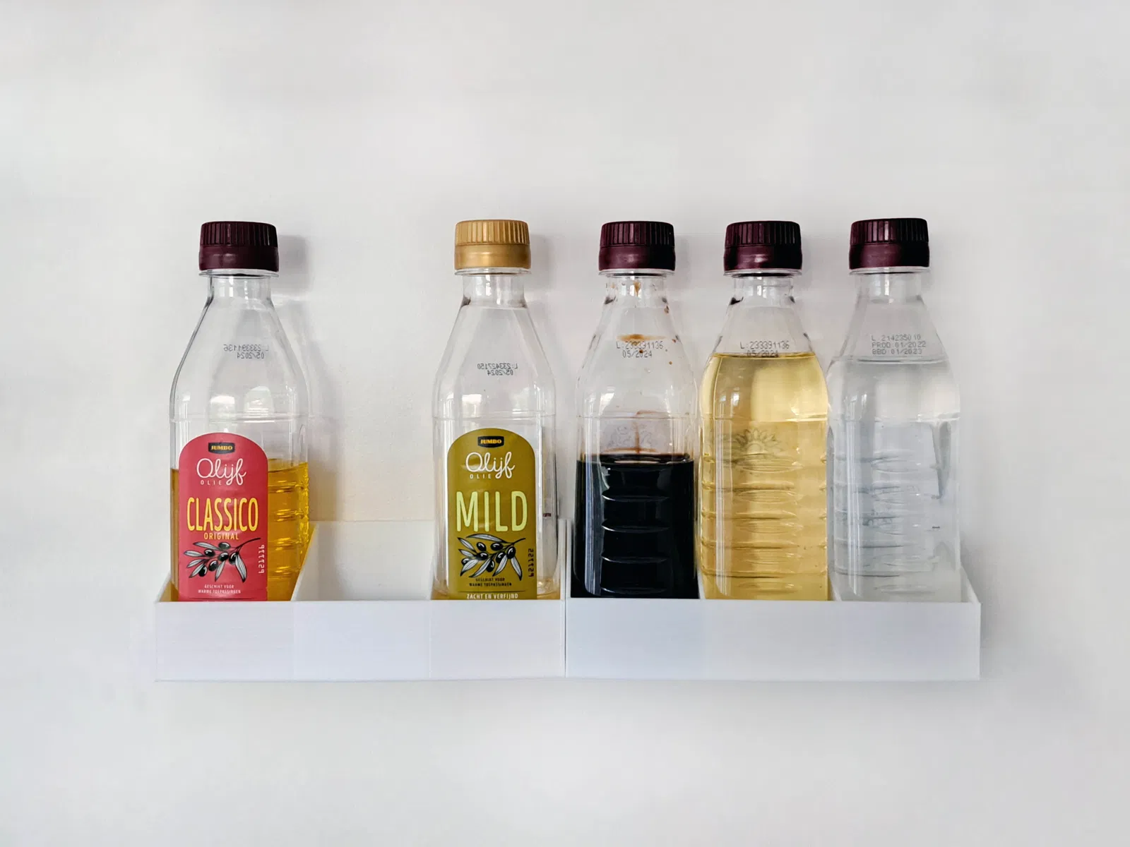 Cái kệ chai này làm ra để đựng mấy chai vuông 50 x 50 mm đó nha. Mấy chai này bán ở siêu thị Jumbo (Hà Lan) đựng dầu oliu đó (nhấn vô đây xem ví dụ nè: https://www.jumbo.com/producten/jumbo-olijfolie-classico-original-250ml-418281FLS).