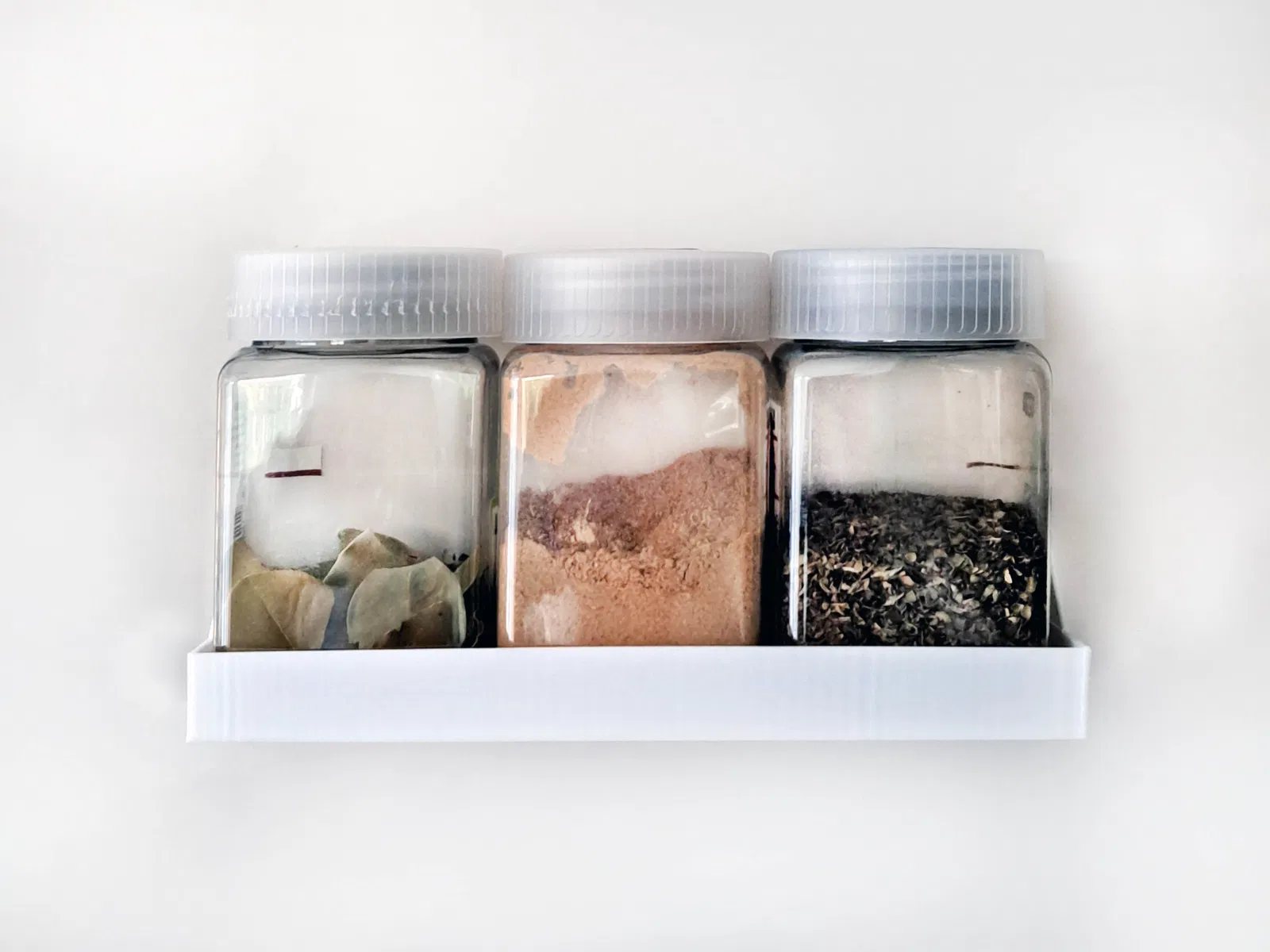 Giá đựng gia vị được thiết kế cho các hũ vuông kích thước 60 x 60 mm, loại thường bán tại siêu thị Jumbo. Thiết kế này để gắn bên trong cửa tủ bếp, giúp hũ gia vị không bị lung lay khi mở. In bằng PLA, không cần support.