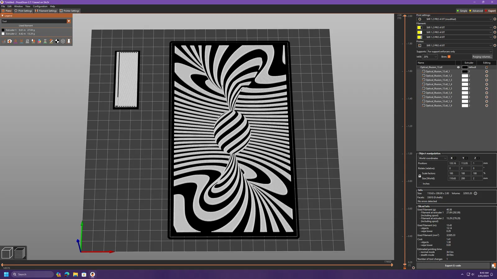 Mô hình "Ảo Ảnh Quang Học Xoắn 1" là một tác phẩm độc đáo, dễ in và có thể tùy chỉnh để phù hợp với máy in đa hoặc đơn đầu phun. Kích thước 110.63mm x 200mm, dày 2mm, hoàn thành trong khoảng 3 giờ. Hướng dẫn chi tiết cho từng loại máy in được cung cấp để bạn có thể tạo ra hiệu ứng ảo ảnh mong muốn.