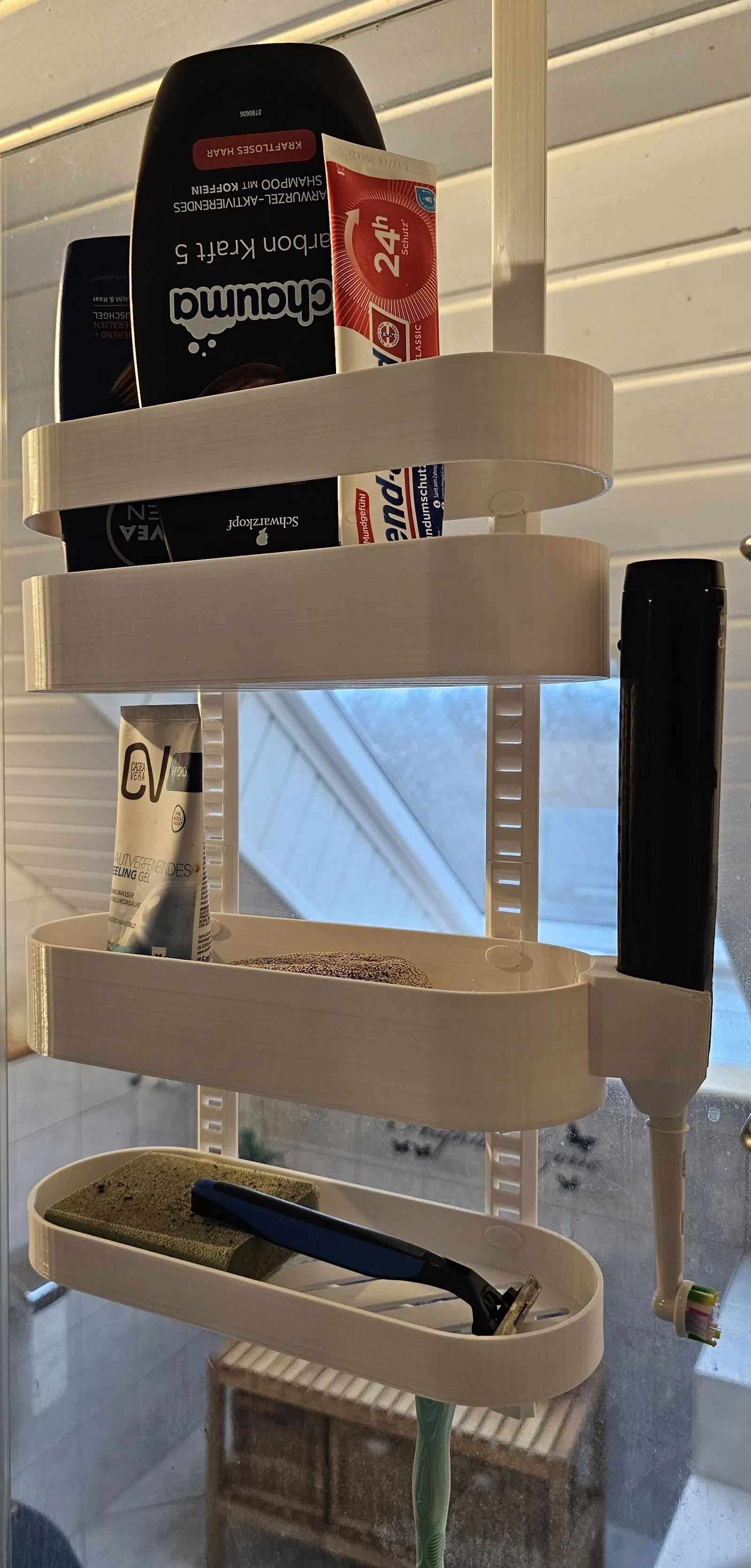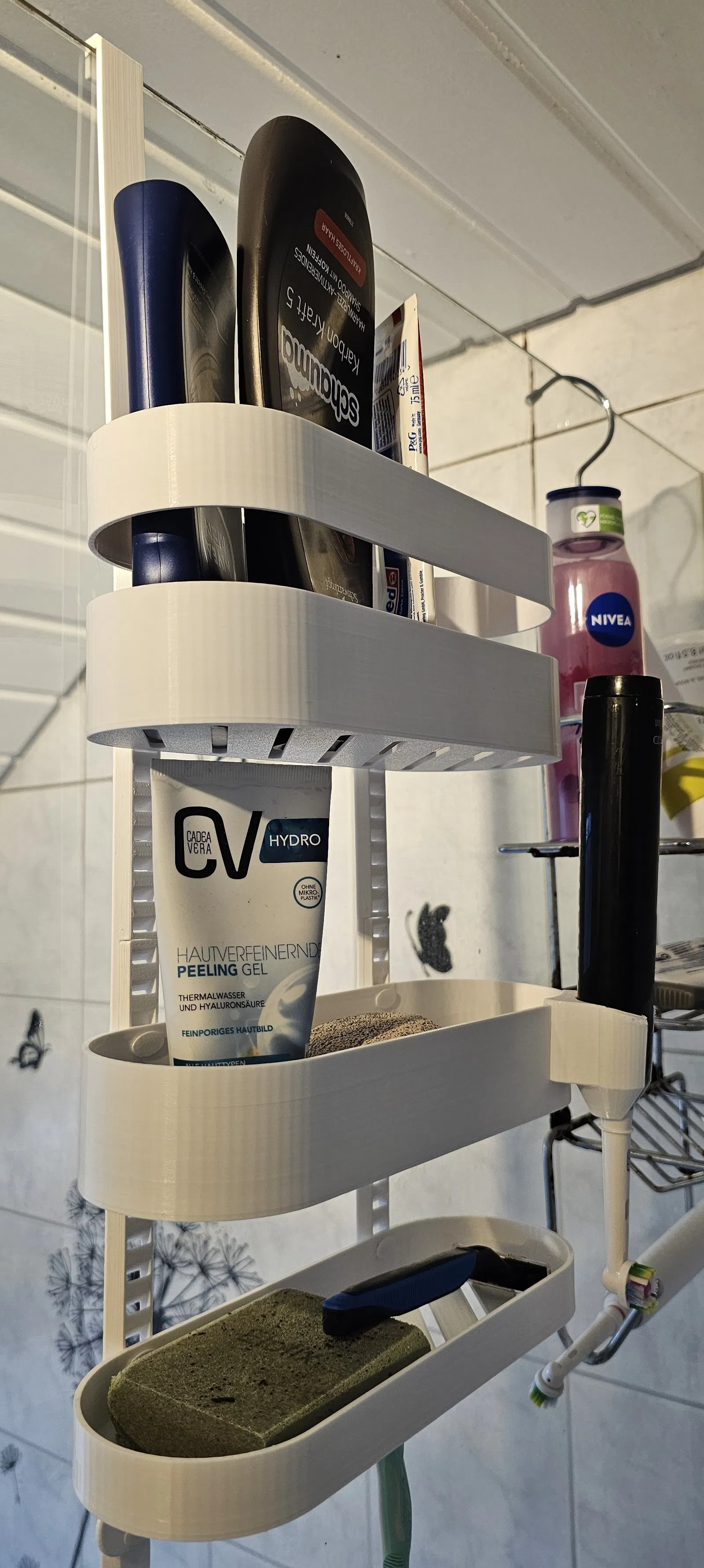 Nên tao thử tự thiết kế cái của riêng mình nè – nếu nó dơ thì bỏ vô máy rửa chén hoặc in cái mới. Nếu cần thêm chỗ để đồ linh tinh trong nhà tắm thì cứ in thêm phần nối dài ra thôi :)