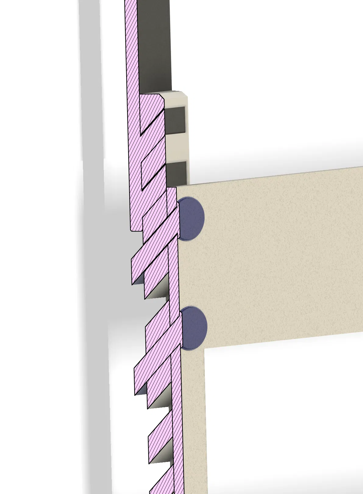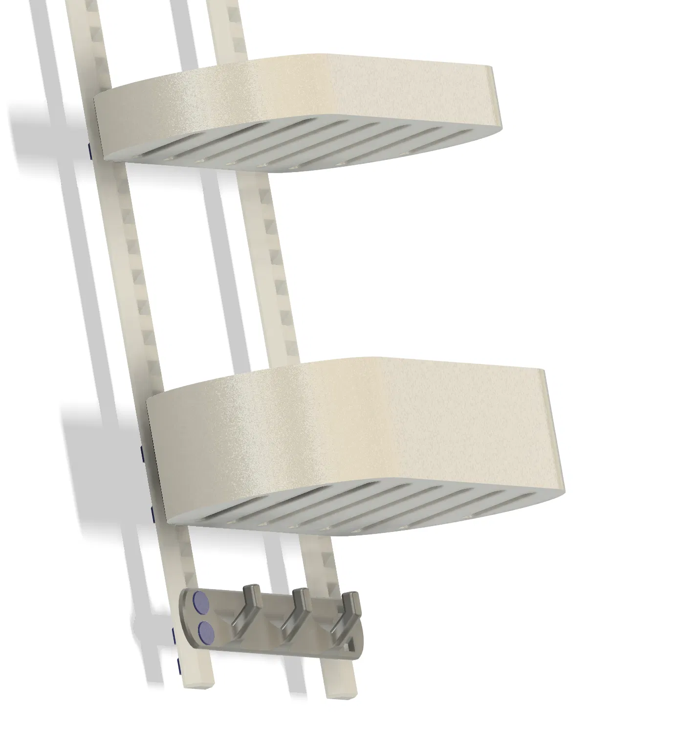 Hiện tại thì chỉ có phần nối dài là cần dán keo thôi – nhưng mà nó được thiết kế để giữ với nhau bằng lực ép (trọng lượng trong kệ). Còn lại mọi thứ chỉ là "bấm" lại với nhau bằng mấy cái kẹp nhỏ xíu đó. Mấy cái kẹp này được thiết kế nhô ra phía sau, vì tao muốn giảm thiểu bề mặt tiếp xúc với nước nhất có thể. Nên mấy cái kẹp nó hoạt động như cái đệm để dựa vào tường.