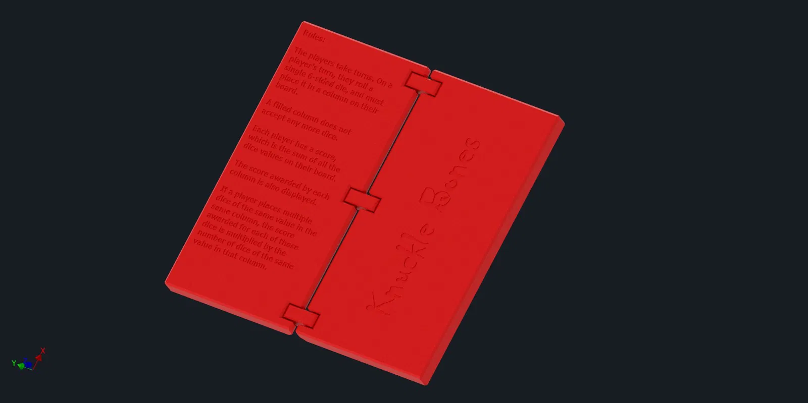Tải về mô hình 3D "Knuckle Bones", một mini-game board game từ Cult of Lamb. Phiên bản 5 này có bản lề rộng hơn và cạnh vát. Yêu cầu nam châm và xúc xắc d6. Khuyến khích in bằng nhựa resin. Tải STL và bắt đầu chơi ngay!