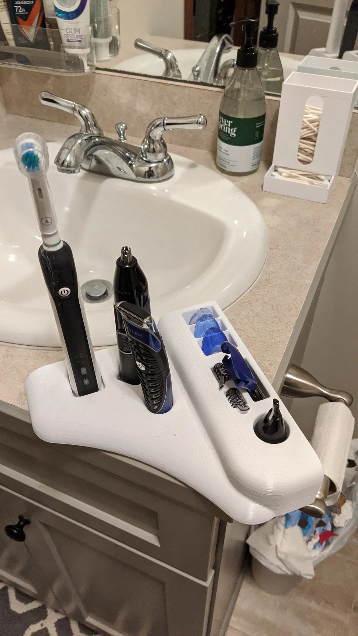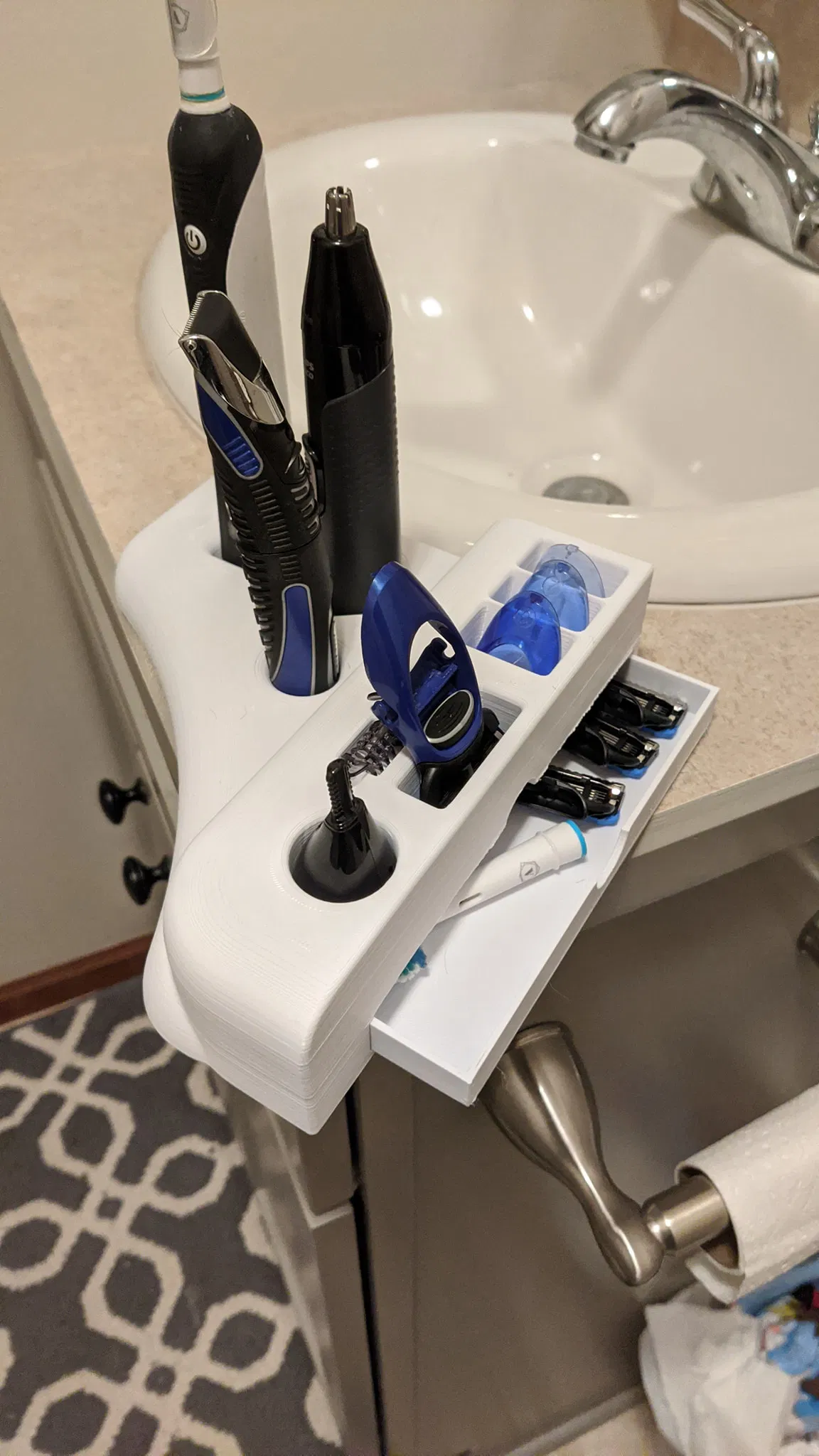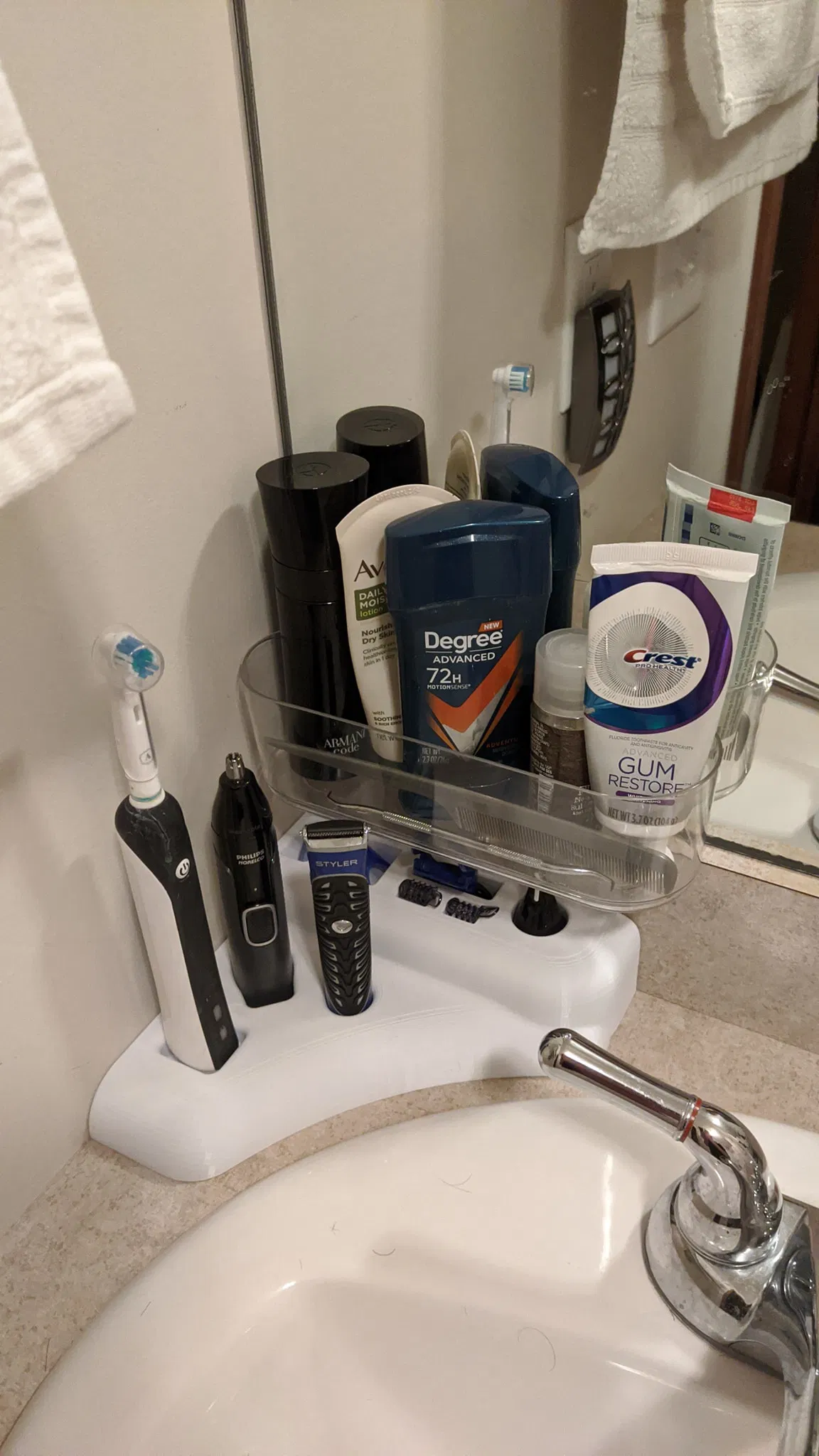 Corner-Organizer - Có hai khe 30x34mm và một khe tròn 23.5mm dành cho bàn chải đánh răng và máy tỉa lông, cùng một khay hứng lớn phía trên ngăn kéo ẩn.
