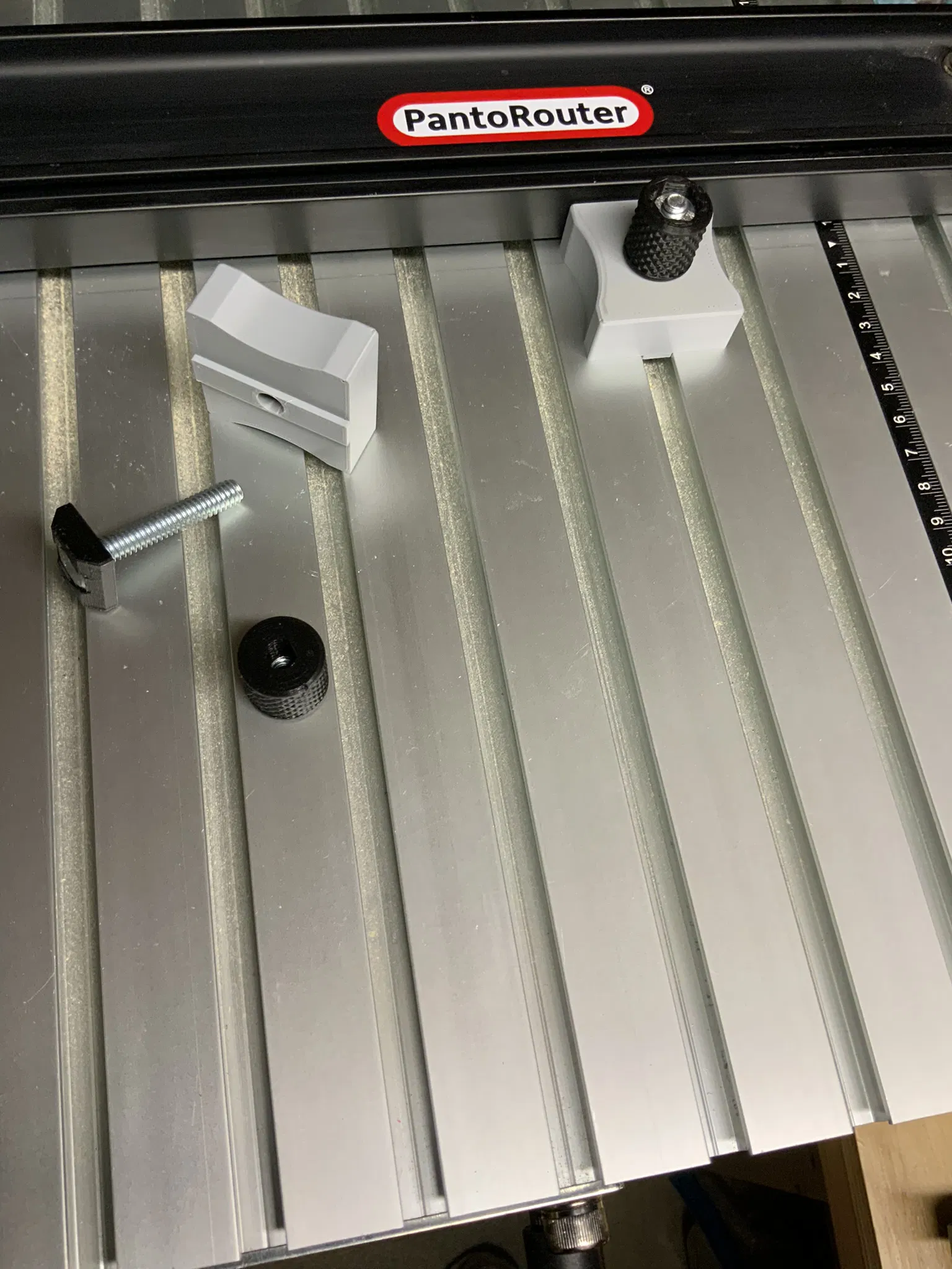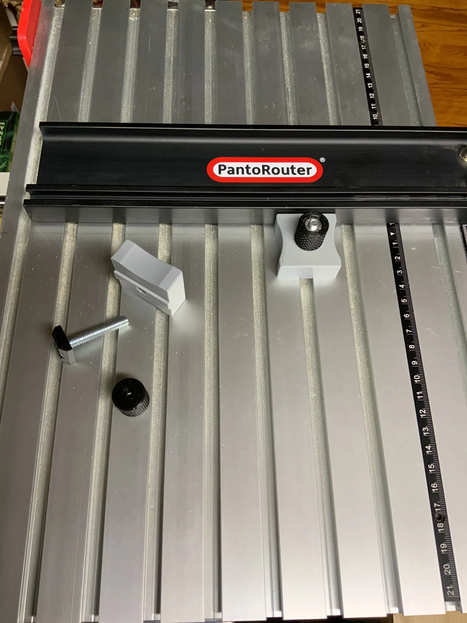 Một khối dừng dùng để định vị hoặc định vị lại phôi hoặc đồ gá, dùng cho Pantorouter hoặc thanh nhôm định hình 3030 có rãnh 8mm. Khối này trượt trong rãnh và được cố định bằng bu lông ¼-20 cùng đai ốc cùng núm vặn có vân.