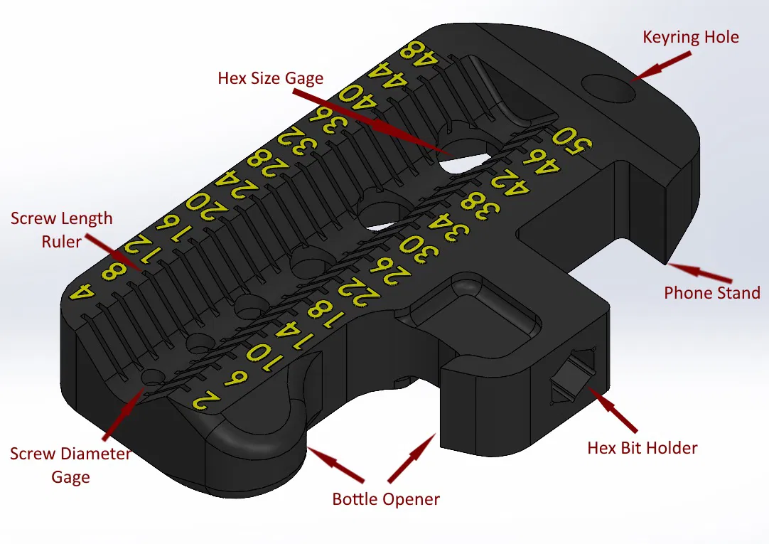 Một cải tiến so với thước đo ốc vít cũ, bổ sung thêm nhiều công cụ hữu ích như đo ốc vít, giữ lục giác, mở bia, giá đỡ điện thoại, và lỗ xỏ móc khóa. Thiết kế nhỏ gọn, tối ưu cho in ấn chi tiết với Prusa Mini. Hướng dẫn in chi tiết để có kết quả tốt nhất.