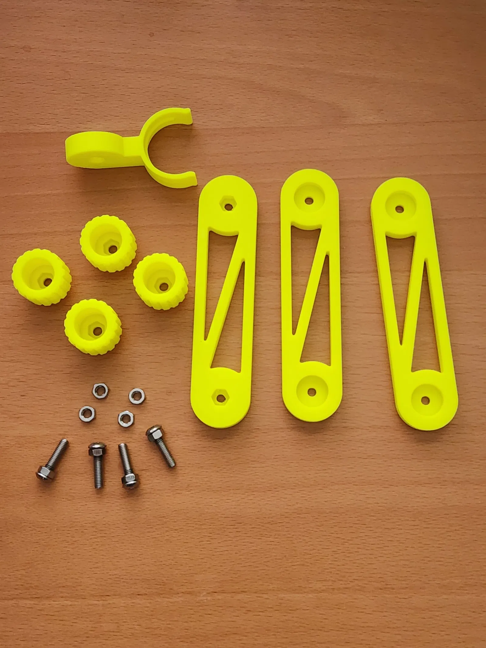 Phần cứng cần 4 con ốc lục giác M5x20mm và 8 cái đai ốc. Nhớ siết chặt một con đai ốc vào mỗi con ốc M5x20mm (có thể thêm keo khóa ren cho chắc, cái này tùy chọn nhưng giúp con đai ốc nằm yên ở đầu ốc).