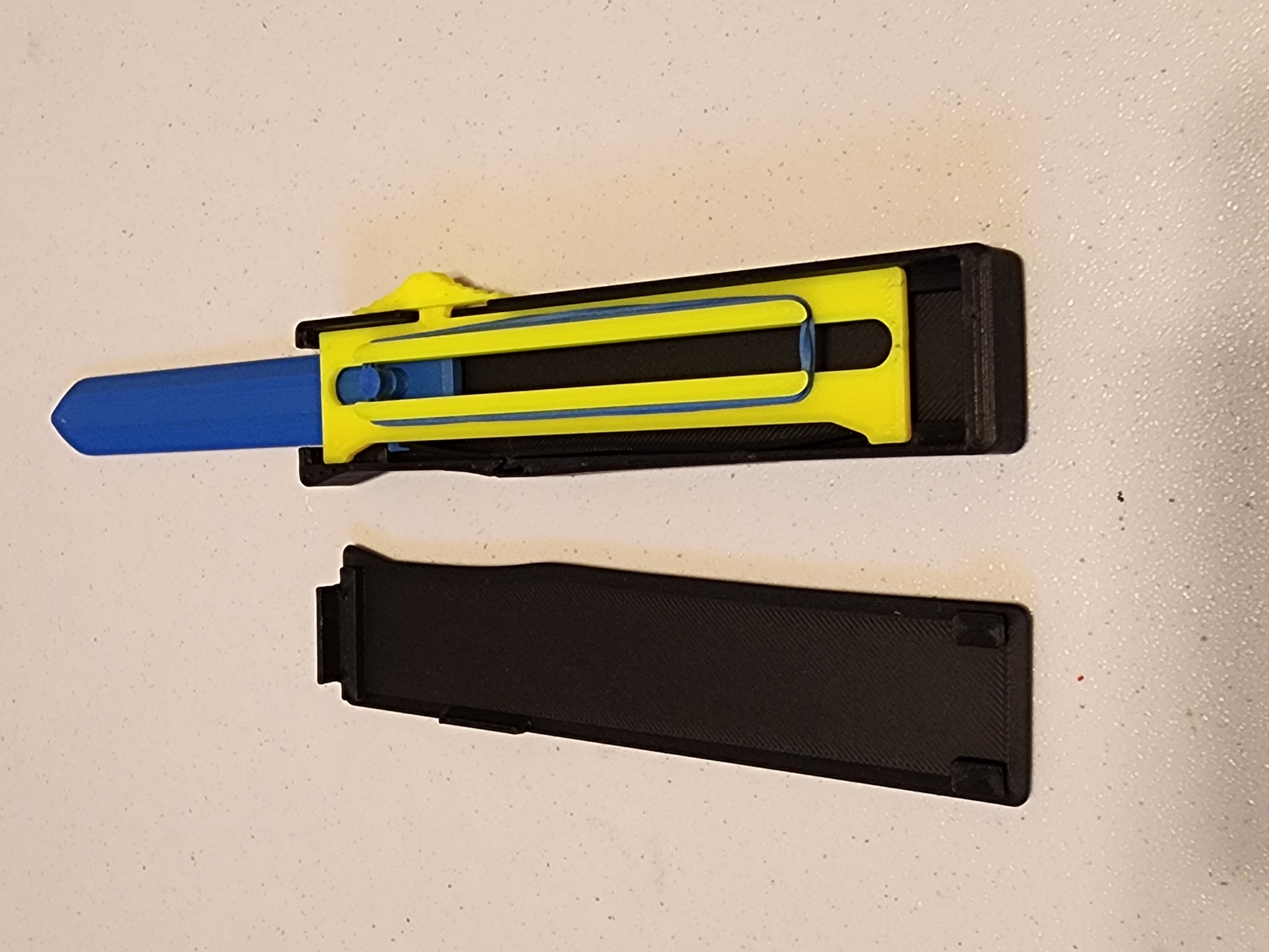Bản chỉnh sửa này thêm một lưỡi dao mở thư và vát cạnh cho nút cò. Phiên bản V2 của lò xo và lưỡi dao cải thiện đáng kể độ tin cậy và giảm rung lắc. Mẹo nhỏ: dùng nhiều dây thun nhỏ thay vì một dây lớn.
