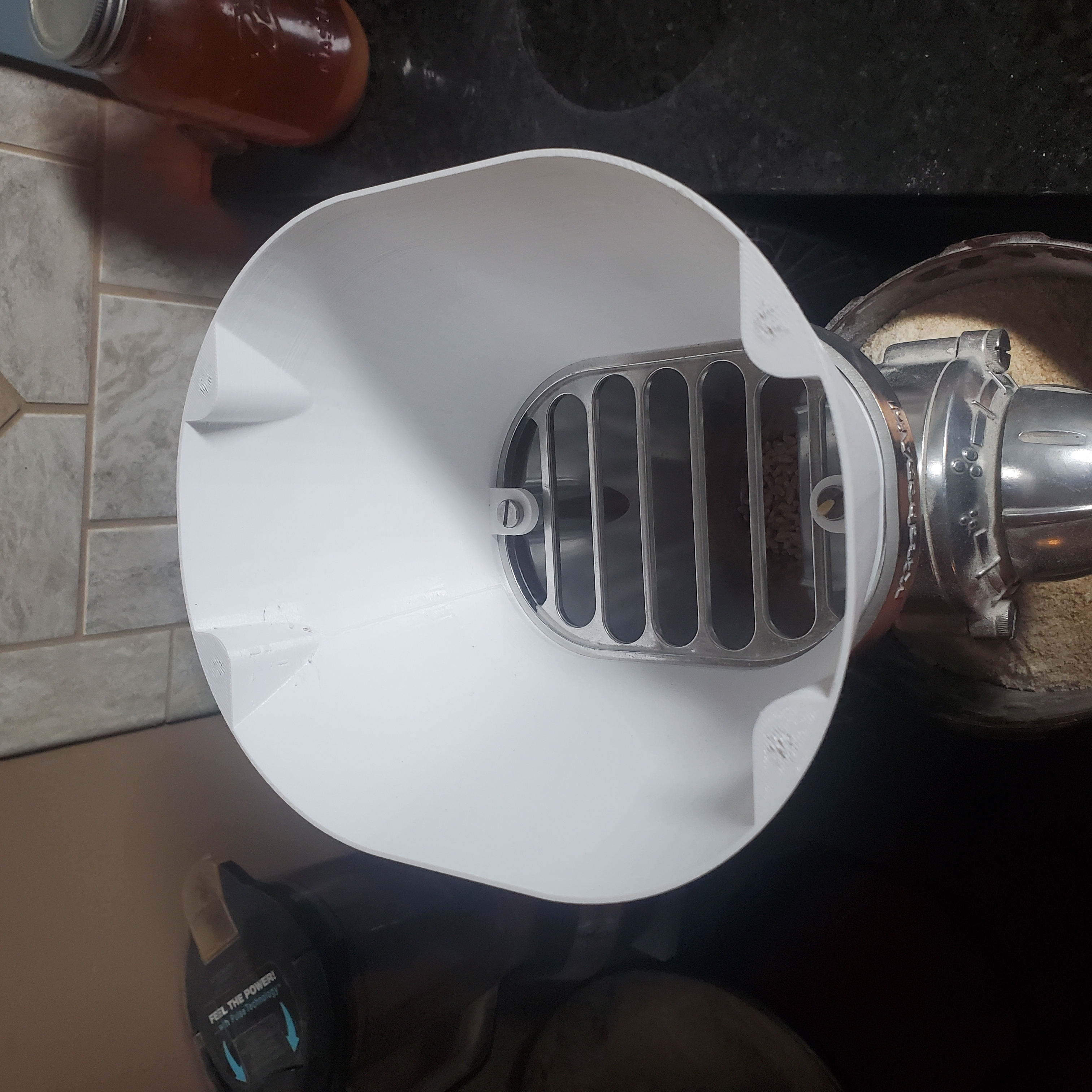 Tui ngán cái phễu nhỏ xíu của cái máy xay ngũ cốc Kitchenaid nhà tui quá nên tui chế ra cái này bự hơn nè. Đổ vô dễ lắm, không có bị đổ tùm lum, với có cái nắp đậy lại khỏi bụi bẩn khi không xài.