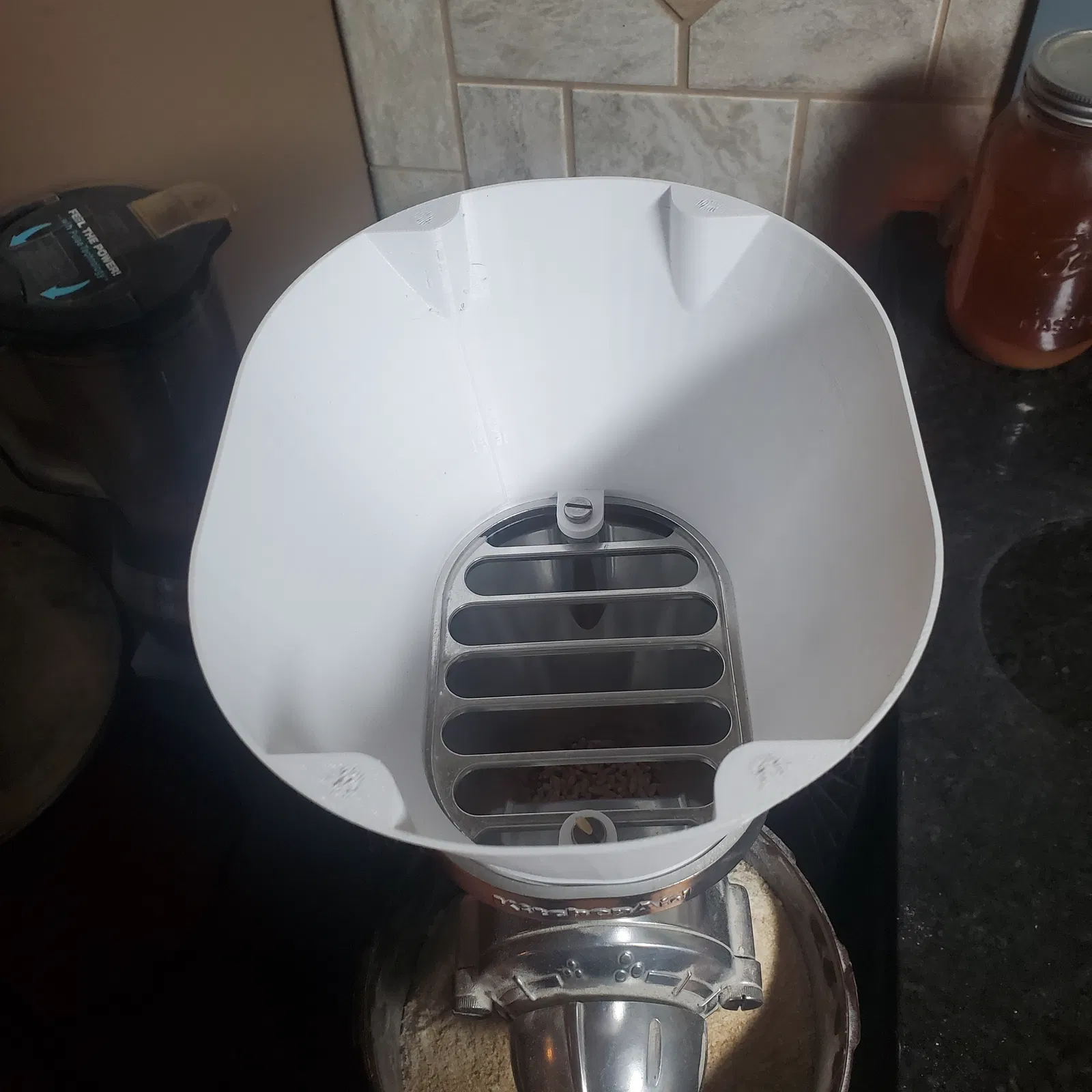 Tui ngán cái phễu nhỏ xíu của cái máy xay ngũ cốc Kitchenaid nhà tui quá nên tui chế ra cái này bự hơn nè. Đổ vô dễ lắm, không có bị đổ tùm lum, với có cái nắp đậy lại khỏi bụi bẩn khi không xài.