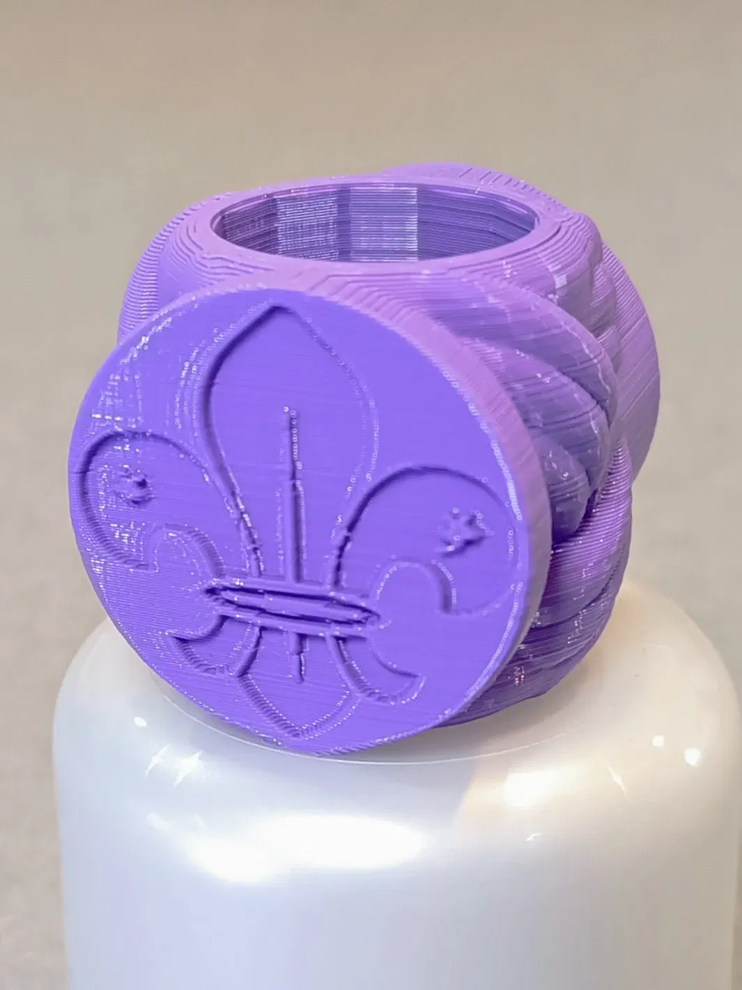 Một bên có hình hoa văn fleur-de-lis của Hướng đạo toàn cầu, và bên kia là hình trefoil của Hướng đạo sinh quốc tế.