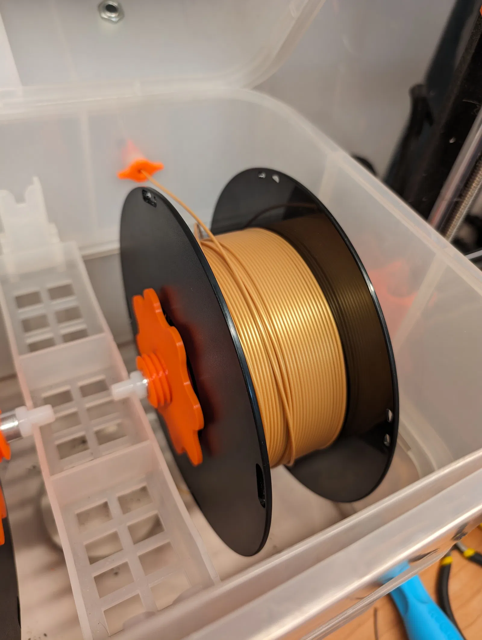 Dây tóc nhựa/cao su TPU đi kèm với máy sấy và đáng lẽ phải lắp vừa vào cuộn dây tóc bị mòn sau một thời gian và rơi ra, có khả năng gây ra thảm họa cho bản in. Tôi đã chán ngấy điều đó và thiết kế cái này.