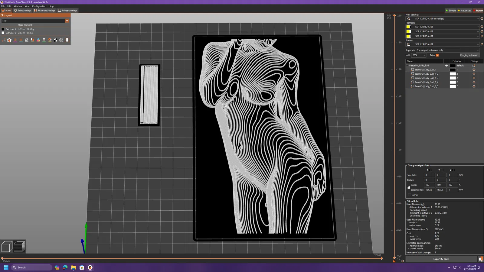 Đối với máy in đa vật liệu (multi-extruder), tách file ra thành các phần rồi chọn phần cho màu thứ hai (phần đầu tiên thường là lớp màu nền, tất cả các phần còn lại thường là lớp màu trên cùng).