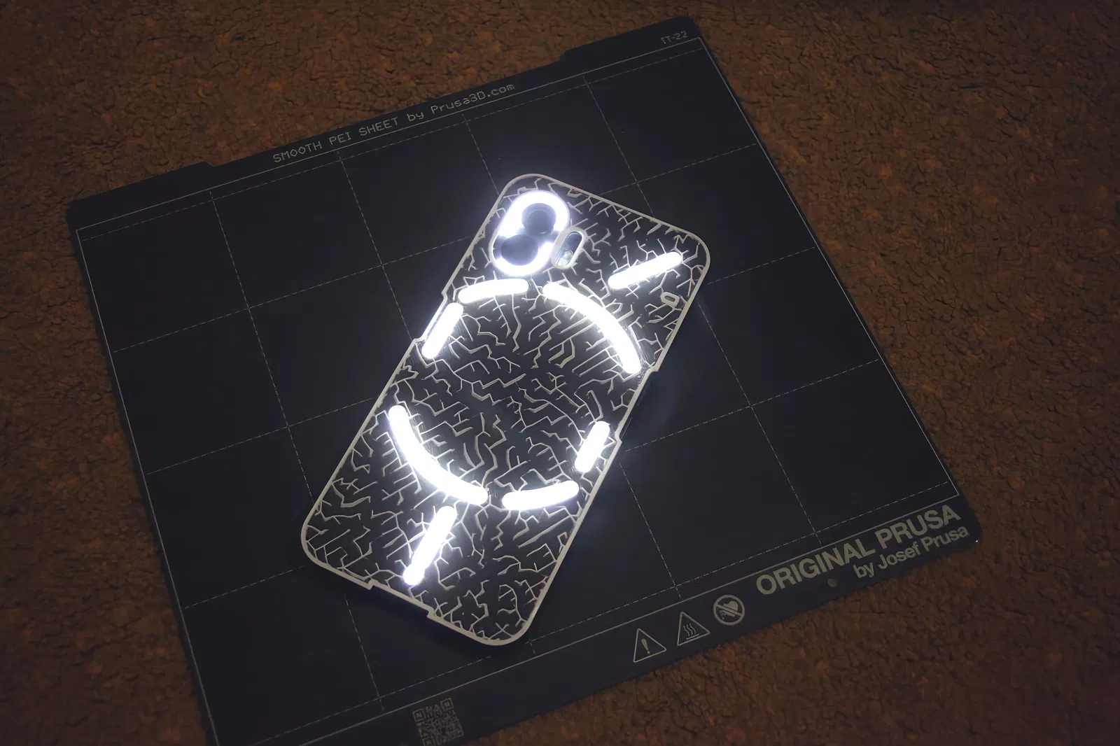 Ốp lưng Nothing Phone (2) này khoe trọn đèn LED mặt sau. In ngon với PLA, PLA+, PETG. Lớp mỏng nhìn xuyên đèn LED, chơi lưới in với loại trong suốt. Có gờ giữ điện thoại, hoặc bỏ qua tùy thích.
