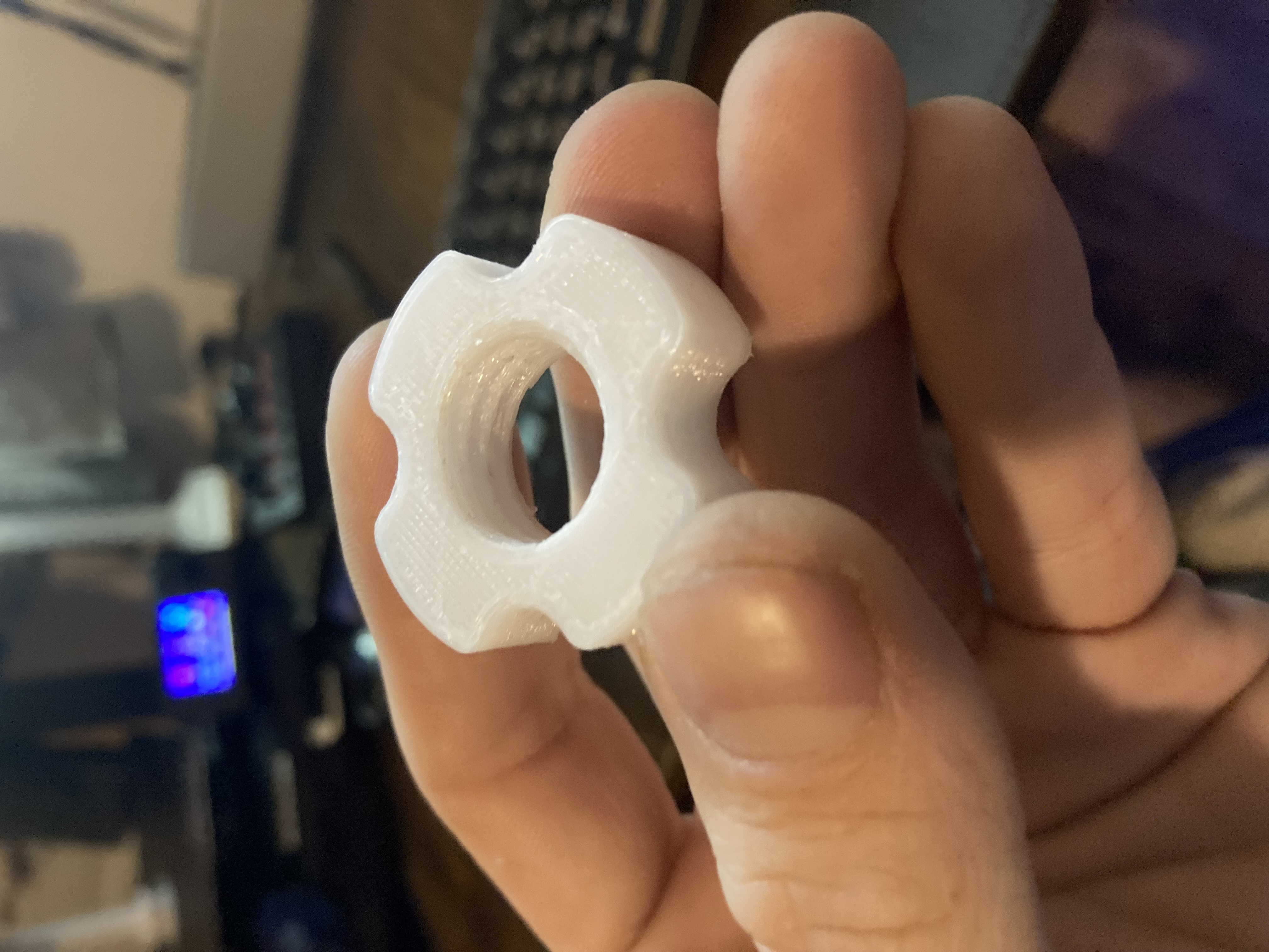 Tui mới mua lại mớ filament ABS cũ từ bạn, mà cái cuộn nó không gắn vừa trên cái Anycubic Kobra 2 Max của tui. Nên tui mới sửa lại cái chỗ gắn cuộn cho vừa với cái cuộn có lỗ đường kính 0.75 inch. Cái này tui in bằng PETG, tốc độ 50mm/s, quạt 15%, bàn nhiệt 80°C và đầu phun 230°C, có bật retraction và mấy chỗ có overhang vẫn in được. Tui xài infill dạng gyroid và in trên máy bàn của tui: Anycubic Kobra Neo. Tui phải mài dũa với hơ nóng chút xíu mới gắn vừa khít được, nhưng cuối cùng cũng làm được.
