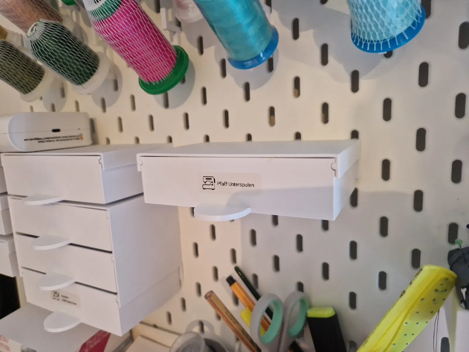 Tìm thấy ngăn kéo cho tường Skadis, kèm theo giá đỡ cho 3 ngăn kéo. Kích thước 129x35mm. In với độ dày lớp 0.4mm, độ điền đầy 30% bằng PLA+.