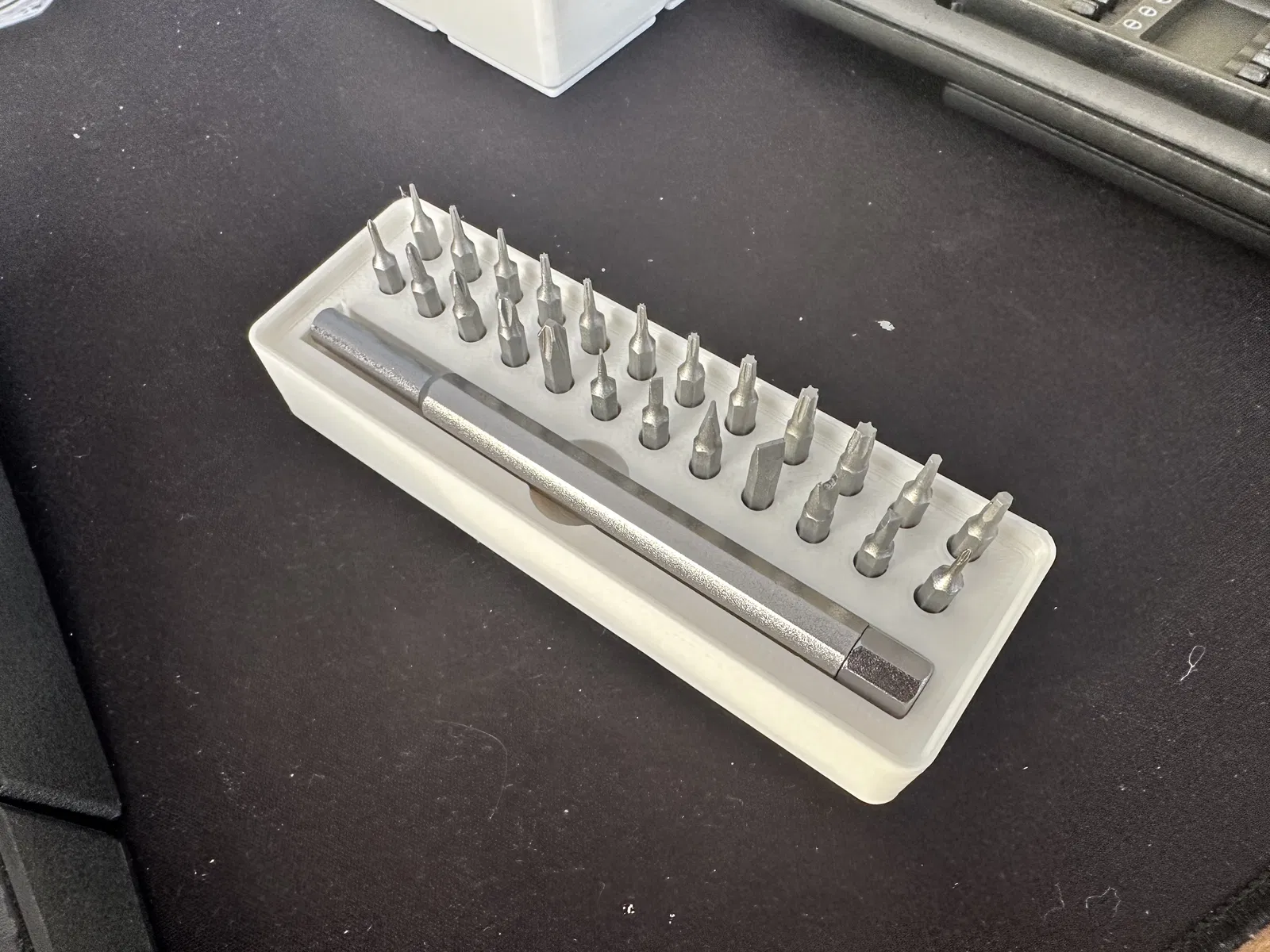 Giá đỡ đơn giản cho một loại tua vít chính xác phổ biến từ AliExpress. Có thể chứa cả tua vít và tất cả các đầu vít đi kèm. Kích thước khay: 1x3x3, lý tưởng để tối ưu không gian lưu trữ.