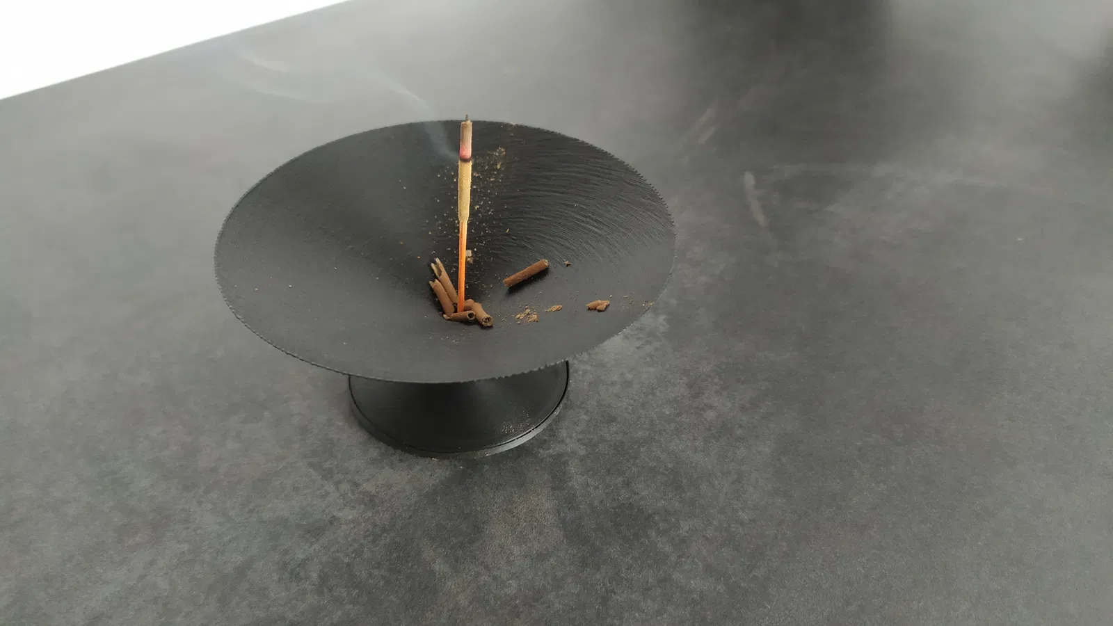 Chỗ cắm nhang đơn giản có gạt tàn tích hợp, giữ nhang đứng thẳng. Phần gạt tàn in bình thường, phần gác nhang in "vase mode" với độ rộng đường đùn 1mm và chiều cao lớp thay đổi. Một thử thách nhỏ khi in, gạt tàn gắn vào đáy và giữ được lượng tàn lớn.