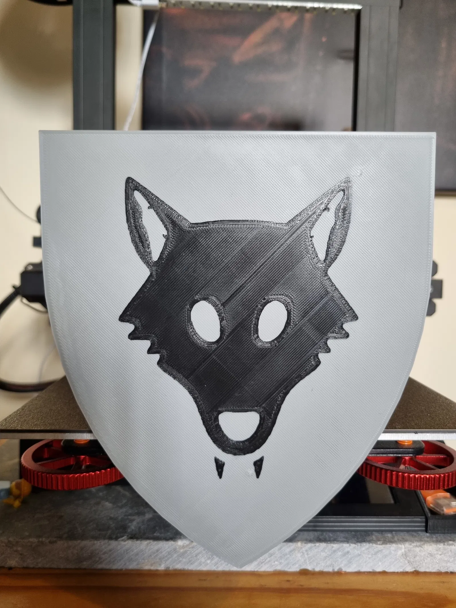 Cái này tui in trên máy Elegoo Neptune 2s dùng sợi Eryone Agate grey. In ở độ cao lớp 0.2mm. Tui khuyên nên dùng 4 lớp trên cùng để có một lớp màu xám hoàn chỉnh trên bề mặt trước khi in logo wolf pack, nếu bạn có ý định đổi màu sợi để logo wolfpack có màu khác. Các chốt ghim khiên là để hỗ trợ căn chỉnh và tui khuyên bạn nên in trên một cái raft nhỏ để hỗ trợ bám dính tốt hơn. Phần cán cầm cần supports nhưng tui đã căn chỉnh để cạnh có supports được giấu bởi chính cái khiên.