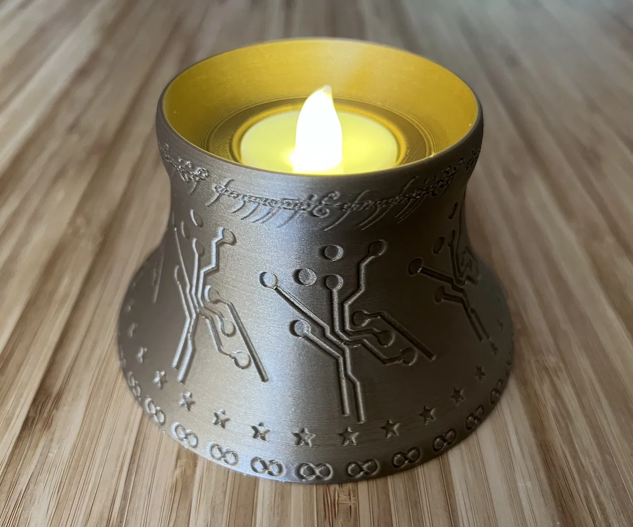 Chiếc chân nến LED "My Precious" này, được thiết kế để vừa với nến LED đường kính 36mm, sâu 32mm. Cảnh báo: KHÔNG ĐƯỢC DÙNG NẾN BẰNG BẤT CỨ CHẤT LIỆU DẦU HAY SÁP NÀO TRONG CHÂN NẾN NÀY - NGUY CƠ CHÁY CAO! Không cần in hỗ trợ. Chúc bạn in vui vẻ.
