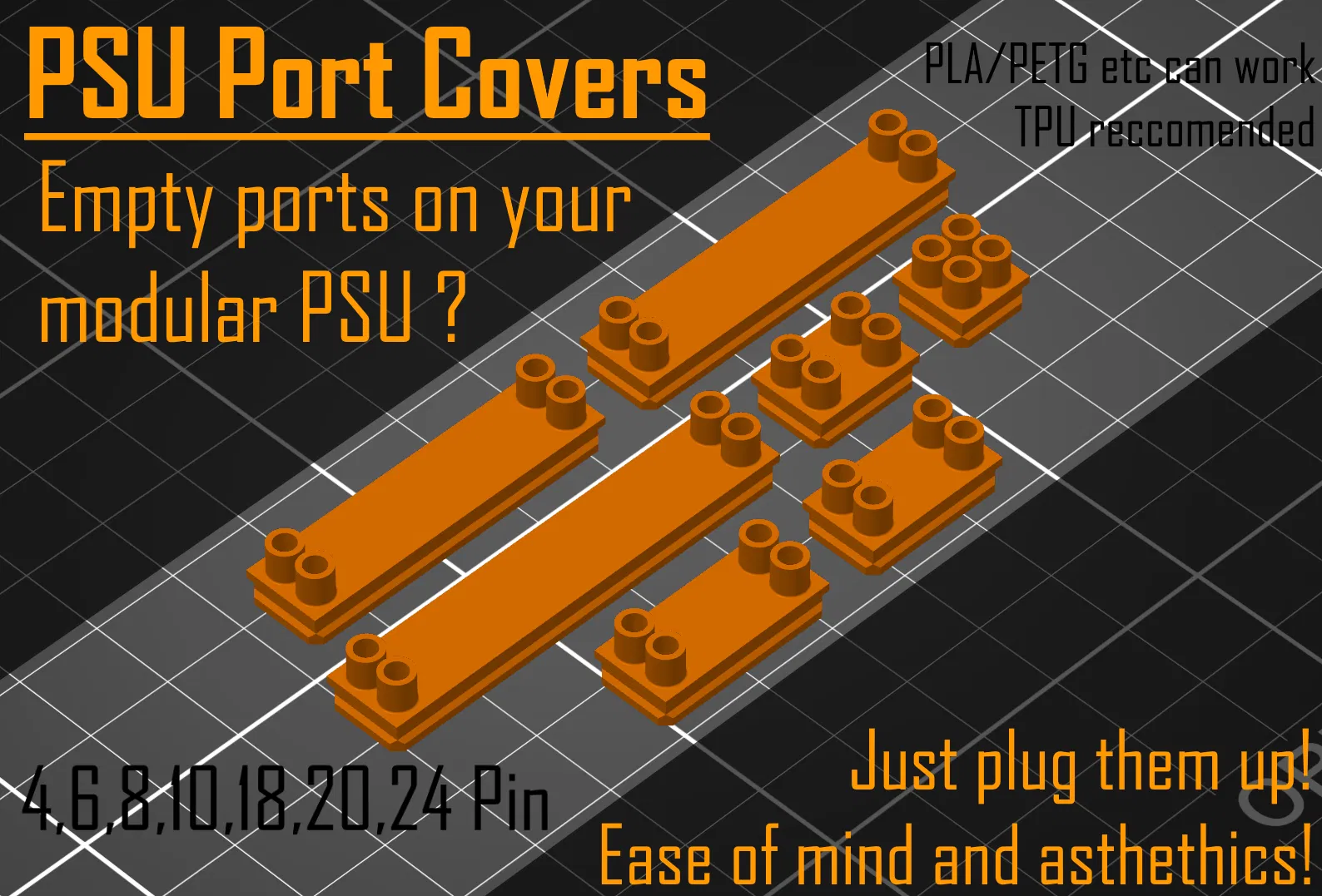 Nắp đậy chống bụi cho hầu hết các bộ nguồn modular kiểu ATX. Giúp bảo vệ cổng nguồn khỏi bụi bẩn. Có nhiều kích cỡ khác nhau, khuyên dùng in bằng TPU, PLA, PETG, ABS.