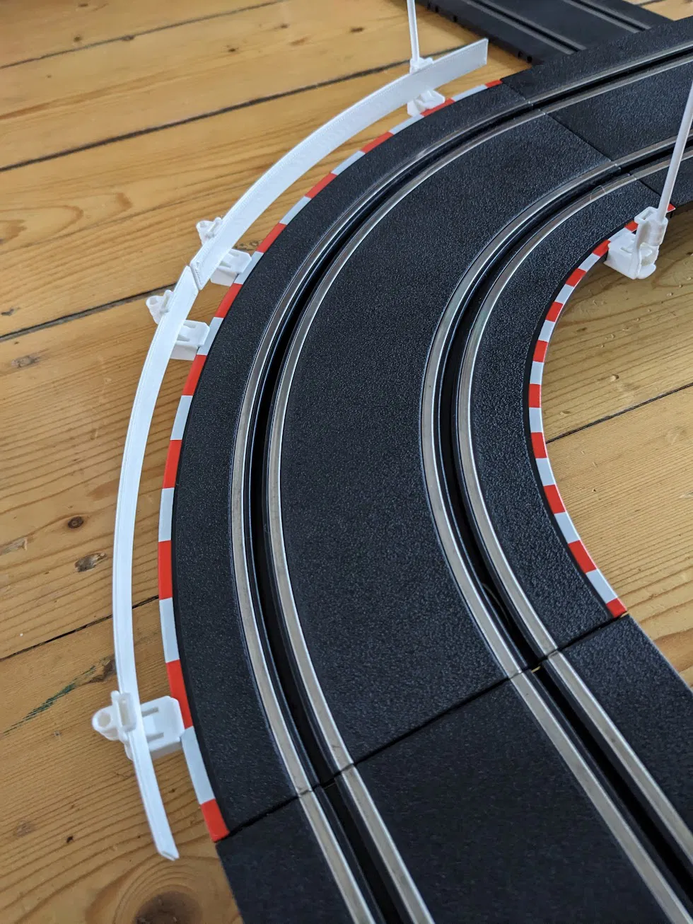 Thay thế mấy cái hàng rào giấy mỏng manh đi kèm với bộ Carrera Go!!!. Hàng rào này vừa khít với kẹp zin. Bạn không cần dùng STL, chỉ cần tạo một hộp trong slicer và chỉnh kích thước là xong. Cần 2 cái cho khúc cua 90°.