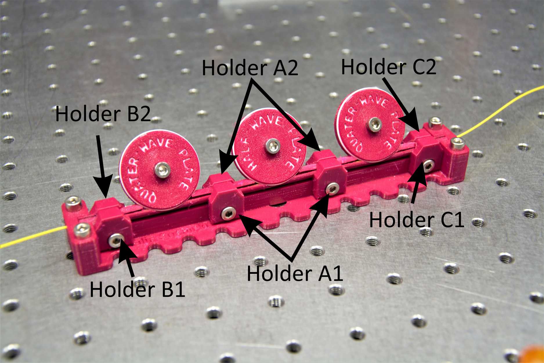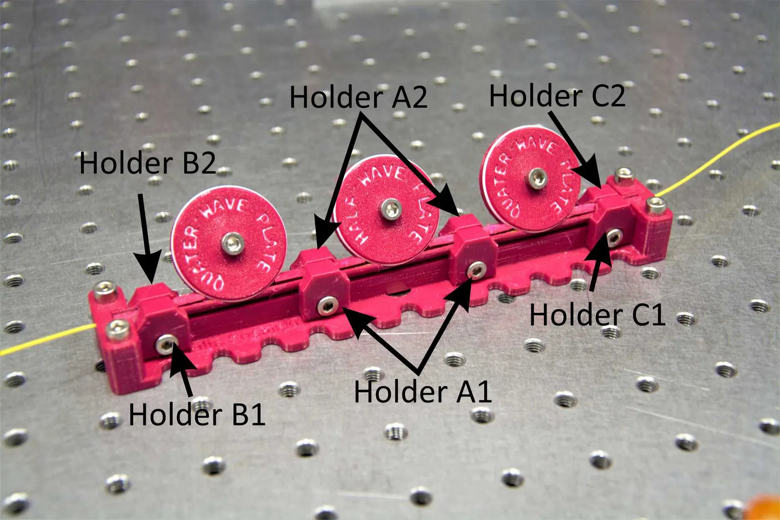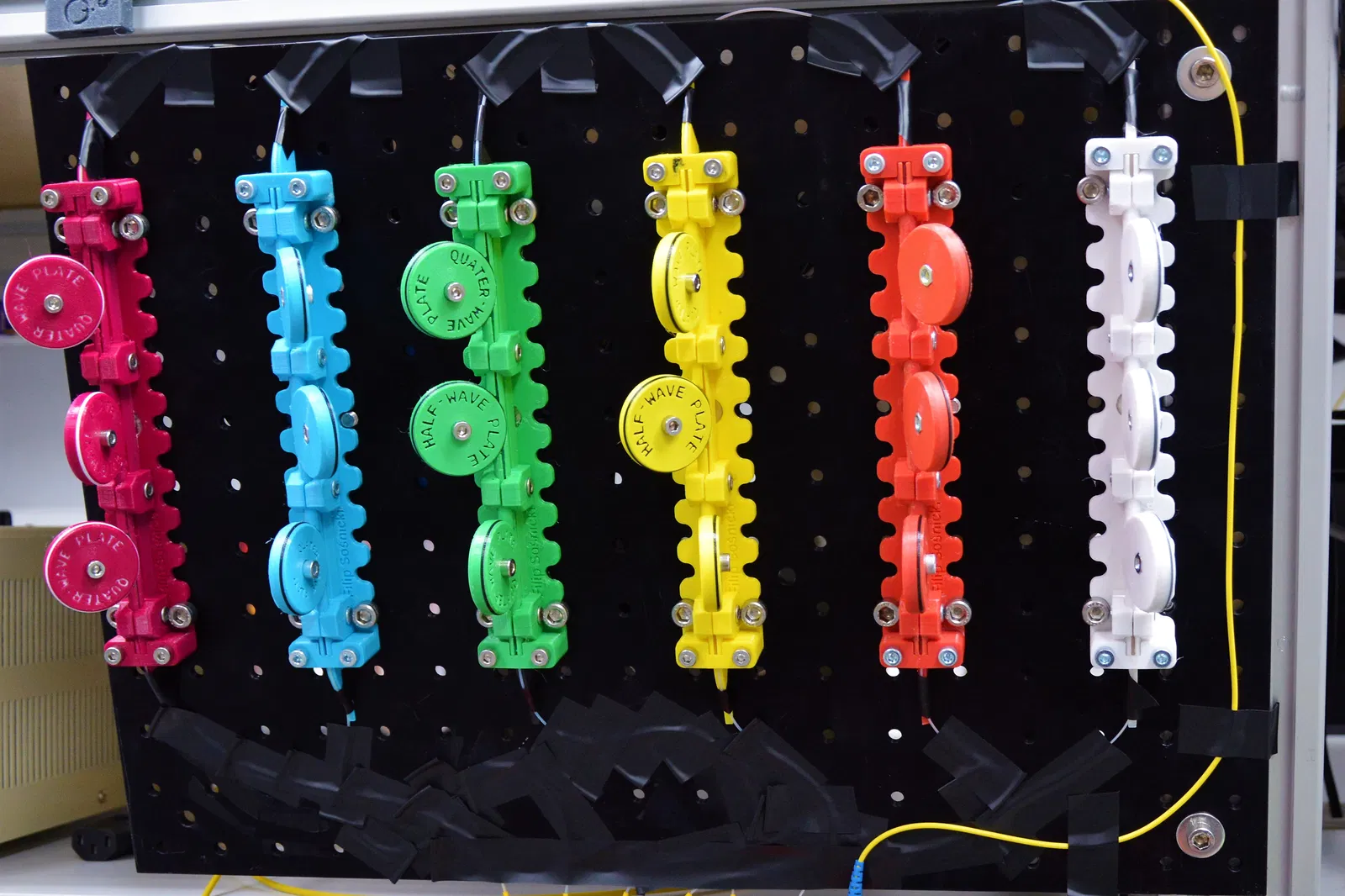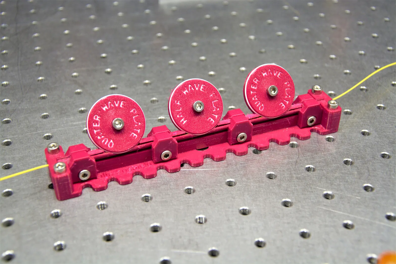 Bộ điều khiển phân cực sợi quang (FPC) được phát triển như một giải pháp mã nguồn mở thay thế cho các bộ điều khiển thương mại. Nhờ đường kính vòng sợi có thể điều chỉnh theo ý người dùng, nó cho phép in FPC cho một bước sóng nhất định, với hoạt động một cánh quạt (single-paddle) gần giống như tấm lưỡng bội hoặc tứ bội không gian tự do. Nam châm Neodymium ở đáy đế giữ chặt FPC trên bàn quang. Đối với các bề mặt không nhiễm từ hoặc thiết lập lâu dài, nhiều lỗ cắt ở mỗi bên của FPC cung cấp các điểm gắn tuyệt vời vào bàn quang hoặc breadboard. Ngoài ra, việc in bằng các màu khác nhau cho phép bạn mã hóa màu cho thiết lập điều khiển phân cực của mình.