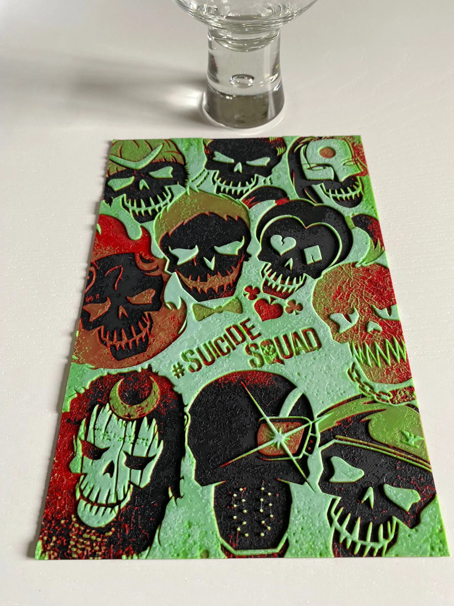 Mẫu in 3D áp phích phim "Biệt Đội Cảm Tử" (Suicide Squad) phiên bản Hueforge. Tác giả chia sẻ kinh nghiệm dùng filament và hướng dẫn đổi màu chi tiết cho bản in.
