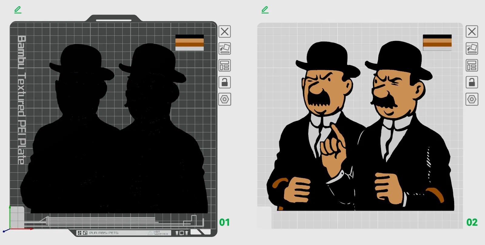 Mô hình Hernández y Fernández của Tintin, được in 4 màu với AMS và tấm PEI vân nổi. Bản in được thực hiện theo kiểu "ngược". Bao gồm các nhân vật nổi tiếng từ truyện Tintin và các thiết kế khác.