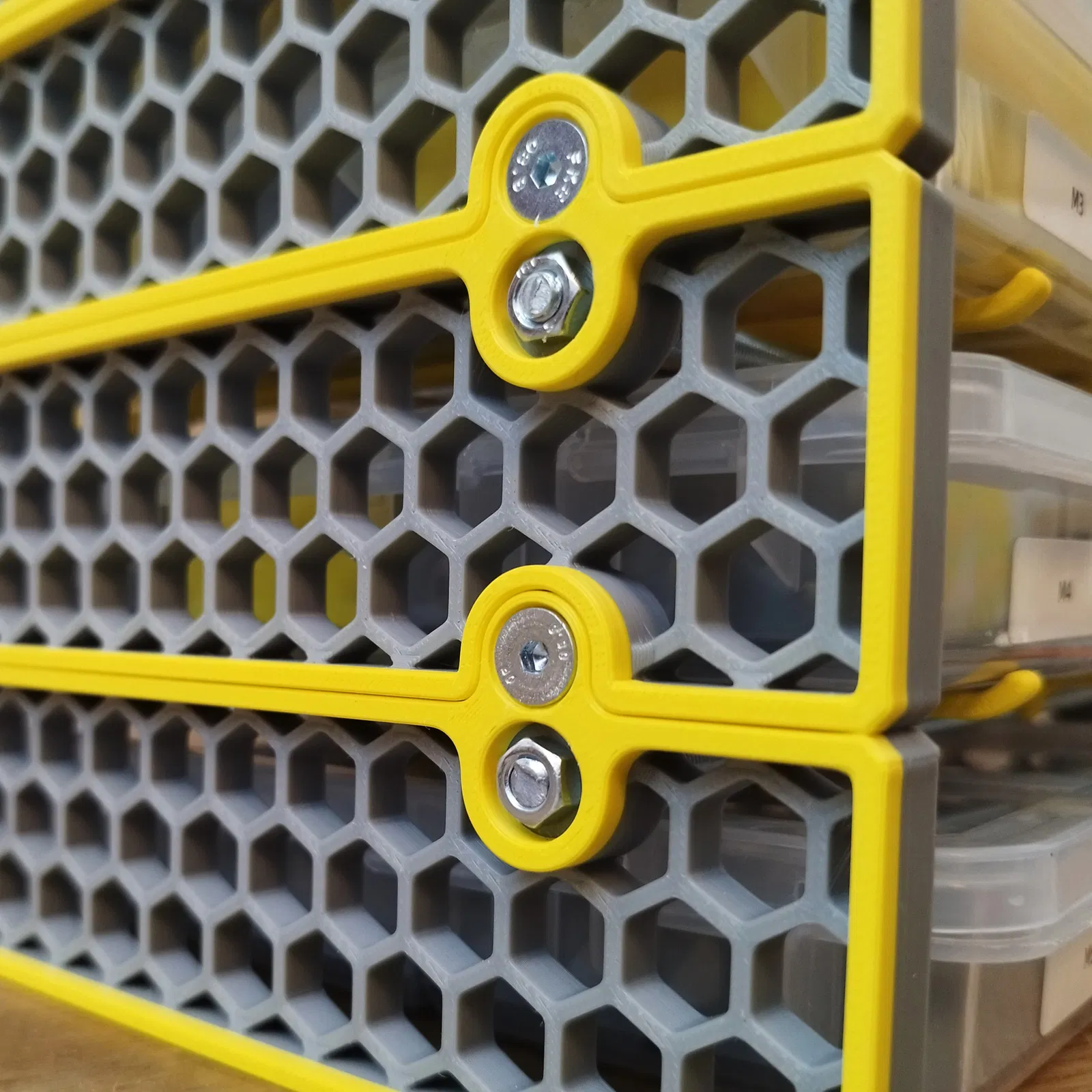 Kệ. Các hộp được đặt vào từ bên hông để tôi không lãng phí bất kỳ không gian chiều sâu nào trên kệ lớn hơn nơi nó đặt. Bạn có thể xếp bao nhiêu tầng lên nhau tùy thích - các tầng được bắt vít với nhau, nhưng đây là bước tùy chọn (chúng có các khớp định vị để không bị tuột ra, và trọng lượng của các hộp đựng đồ đã đầy sẽ giữ chúng cố định); tuy nhiên tôi vẫn khuyên bạn nên làm vậy. Hai nửa được nối với nhau bằng hai thanh ren, những thanh nối nhỏ có đầu dốc được đặt lên các thanh ren này để tránh làm hỏng hộp đựng đồ và tránh bị rơi ra dễ dàng.
