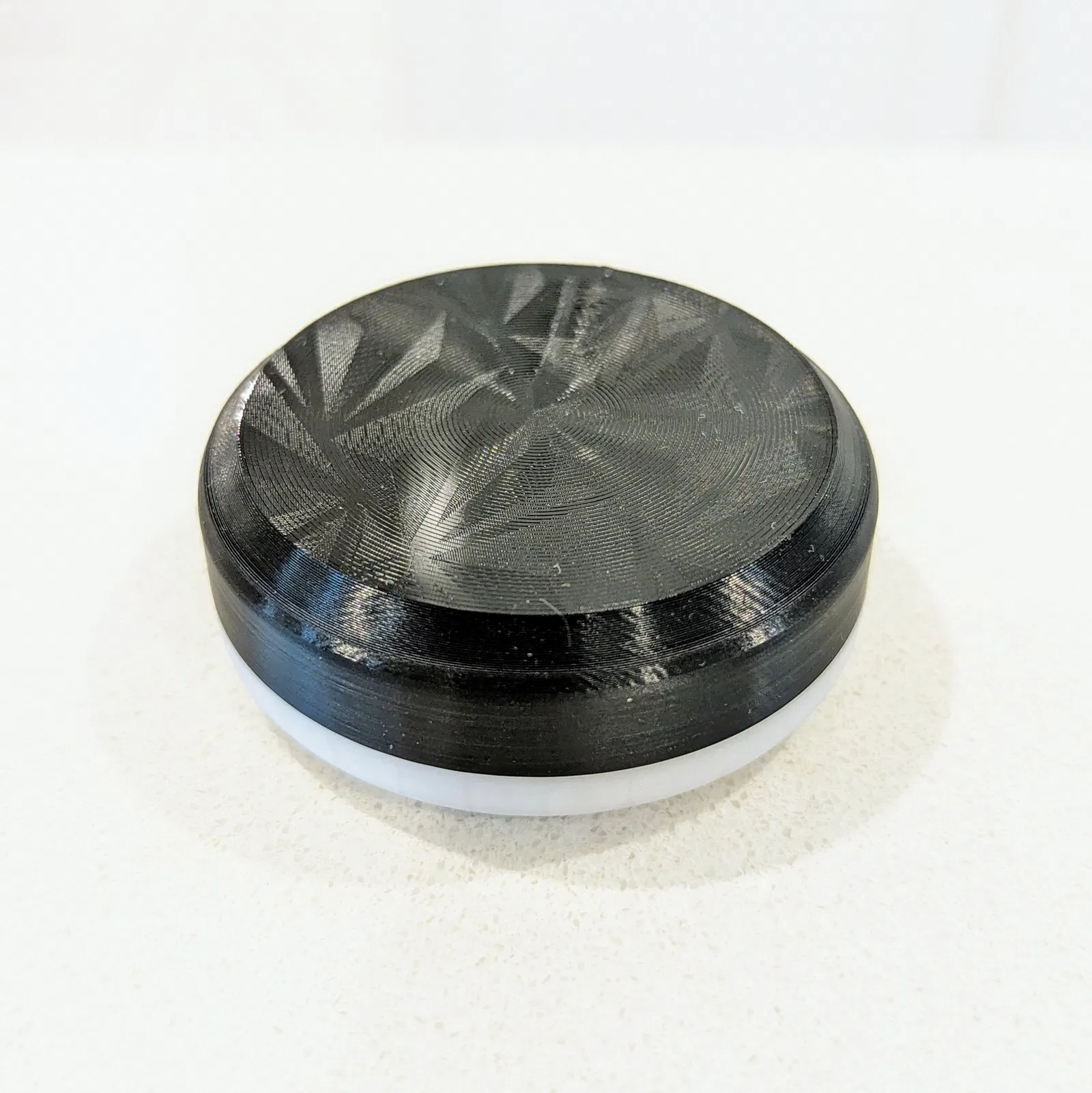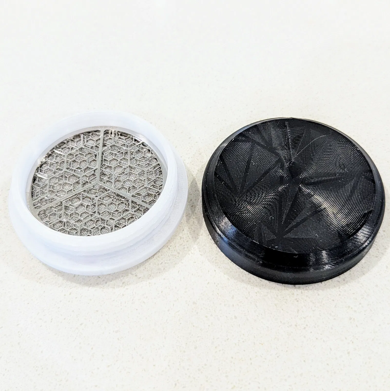 Hộp đựng màn lọc tròn cho máy pha cà phê đáy bằng Sworksdesign. Nắp hộp có thể vặn vào đáy, có chừa thêm không gian cho các mẫu màn lọc tương lai. In không cần vật liệu hỗ trợ.