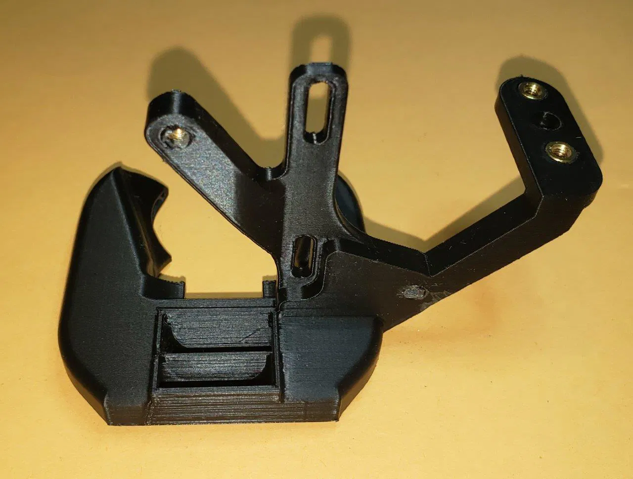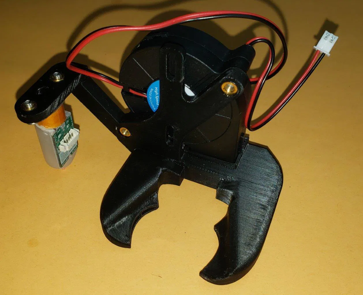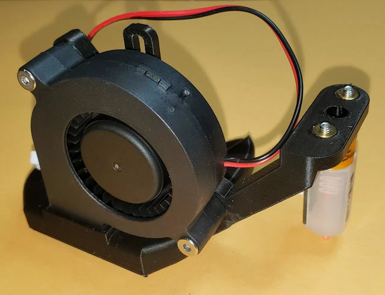 Trong hình thì cái quạt gió được in bằng PLA màu đen, thực ra thì nên dùng PETG, ABS, nylon, v.v. (mặc dù mình nghi cái cuộn PLA này bị dán nhầm nhãn, nó cần tới 260C để in. Có thể nó là PC, cái đó cũng tốt).