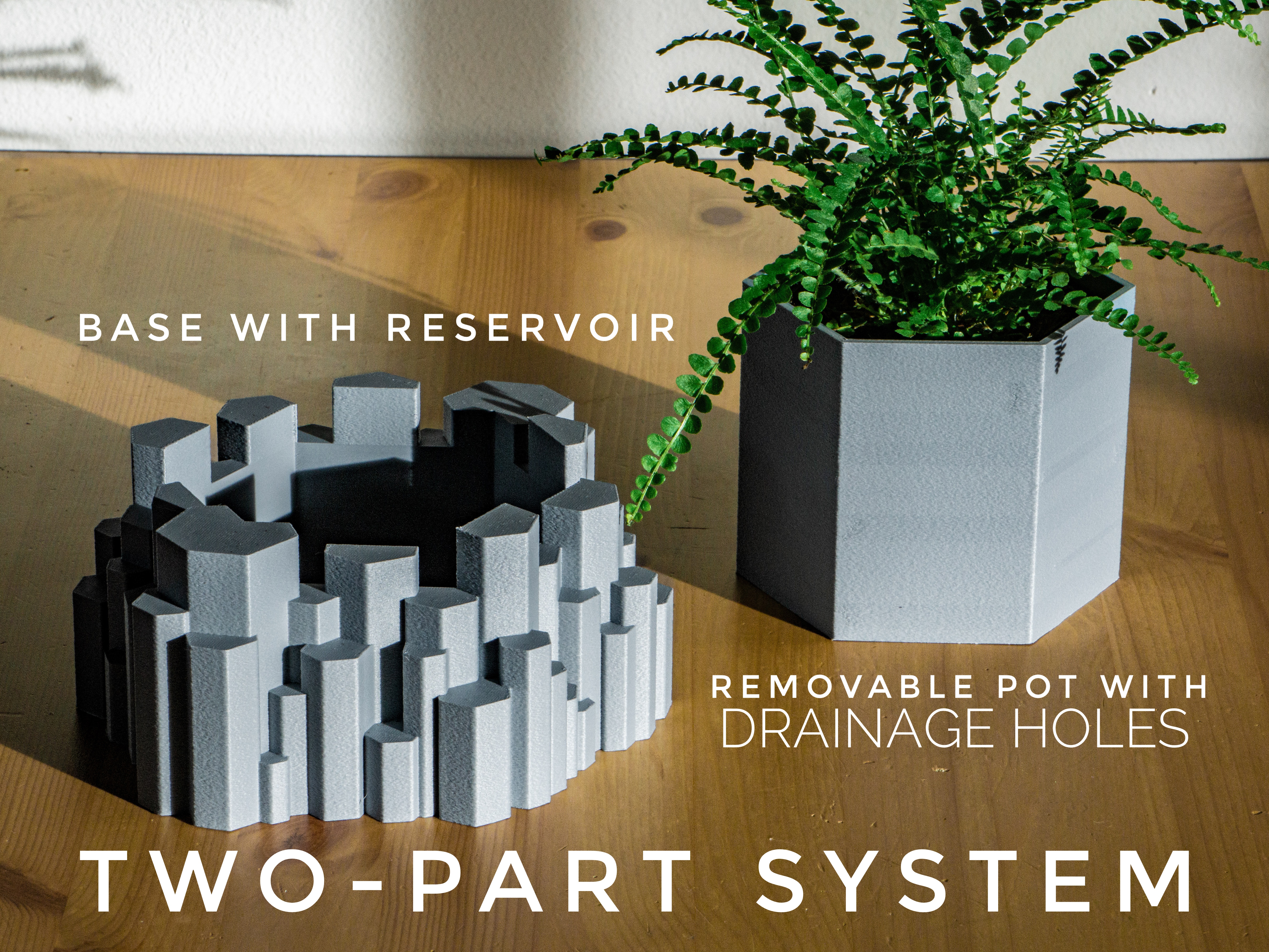 Chậu trồng cây hai phần lấy cảm hứng từ cột đá bazan ở Iceland, có lỗ thoát nước và khay. Thích hợp cho cây mọng nước, xương rồng và cây trồng trong nhà. Kích thước đa dạng. Cần cài đặt in chi tiết để có độ khít tốt nhất.