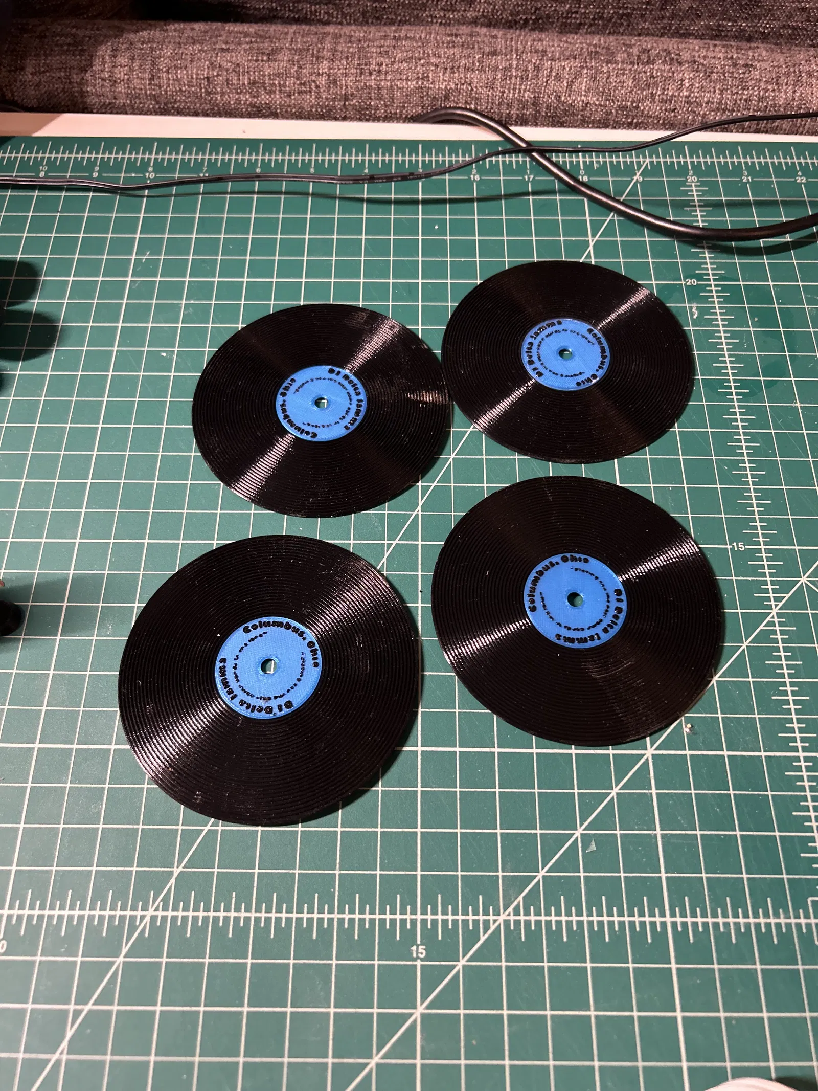 Bộ gồm 4 đế lót ly có thể xếp chồng lên nhau, trông giống như những chiếc đĩa than trên mâm đĩa than. Tôi đã thêm văn bản cá nhân hóa lên trên tệp "Tâm đĩa" khi in để có thể làm quà tặng!
