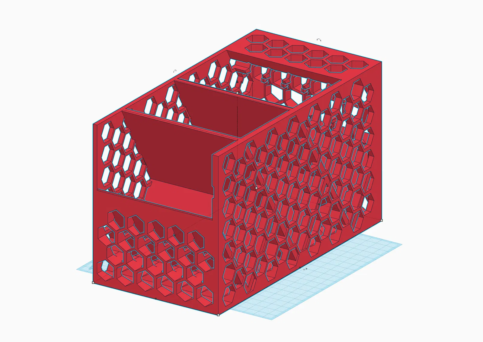 Cách in tốt nhất là để ngửa cái đế đựng lên mặt bàn in, như vậy thì mấy cái kệ với mấy cái hình lục giác sẽ được hỗ trợ tốt trong lúc in.