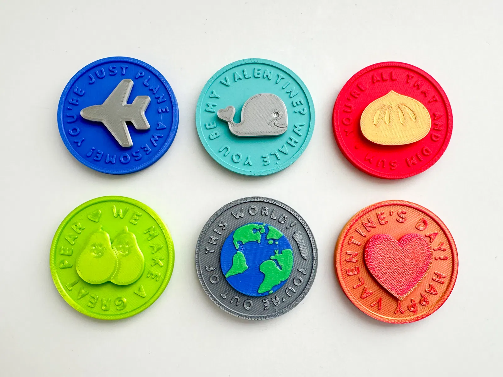 6 mẫu spinner hình đồng xu chủ đề Valentine siêu cưng, làm quà tặng đổi trong lớp thì hết sẩy. Có đủ file "coin", "spinner", "back cap" cho mỗi mẫu. In bằng PLA, infill 15-20%. Lắp ráp đơn giản, đường kính khoảng 2 inches.