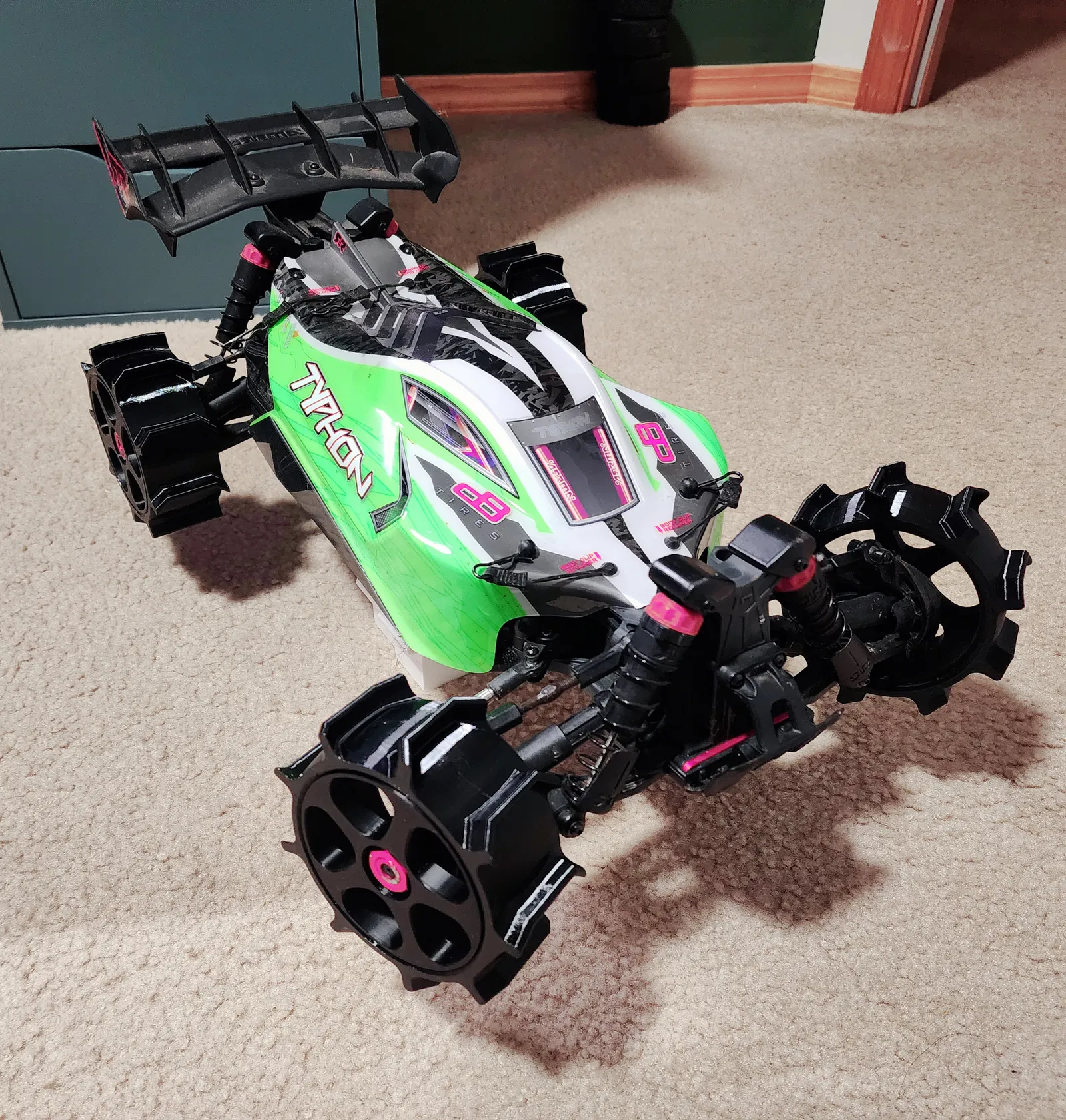 Bộ lốp và mâm "Paddle Tires" được thiết kế riêng cho xe ARRMA Typhon Mega. Lốp in từ TPU cho độ bám tốt, mâm in từ PLA Pro cứng cáp. Kích thước lục giác bánh xe là 17mm, phù hợp với nhiều loại xe. Lắp ráp đơn giản, không yêu cầu hỗ trợ phức tạp.