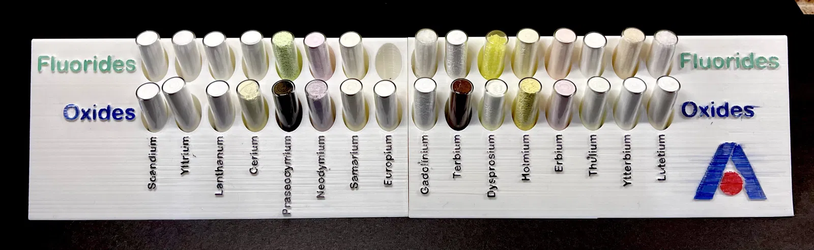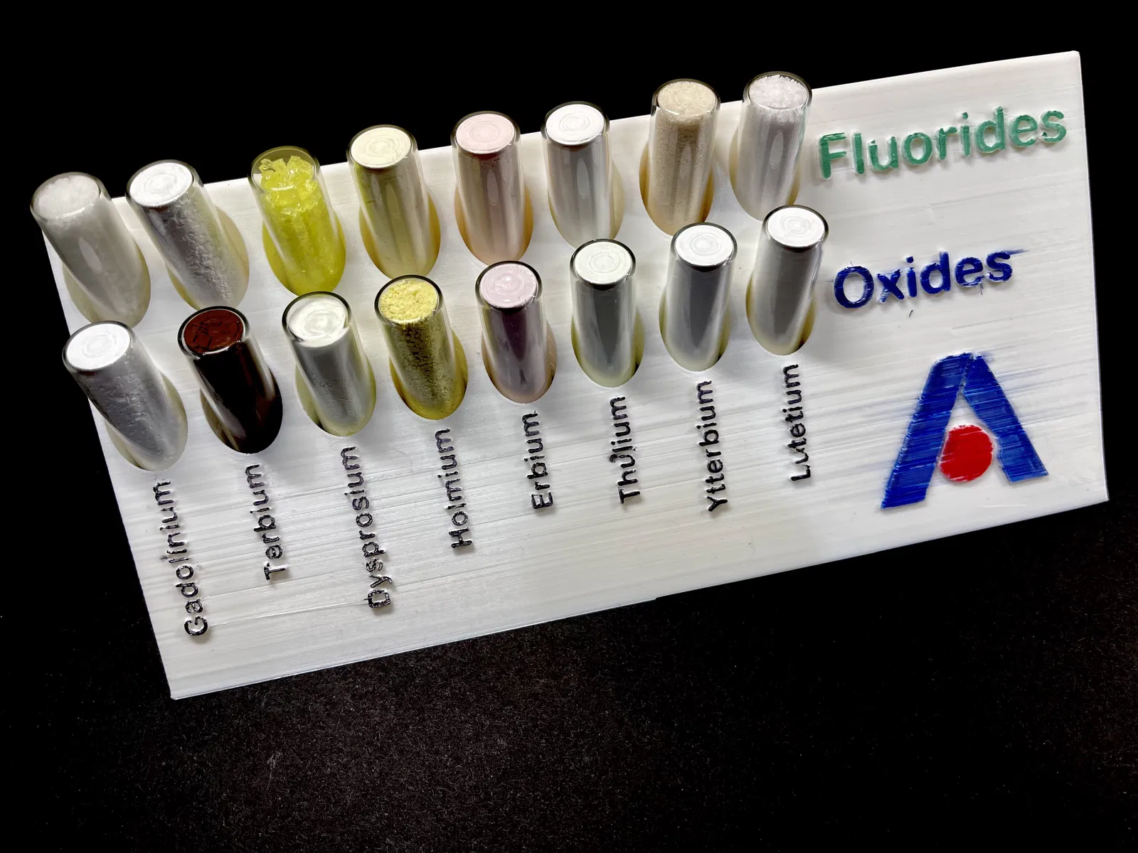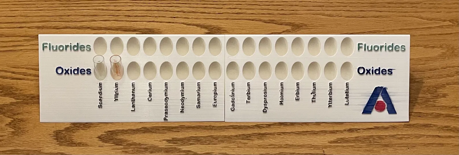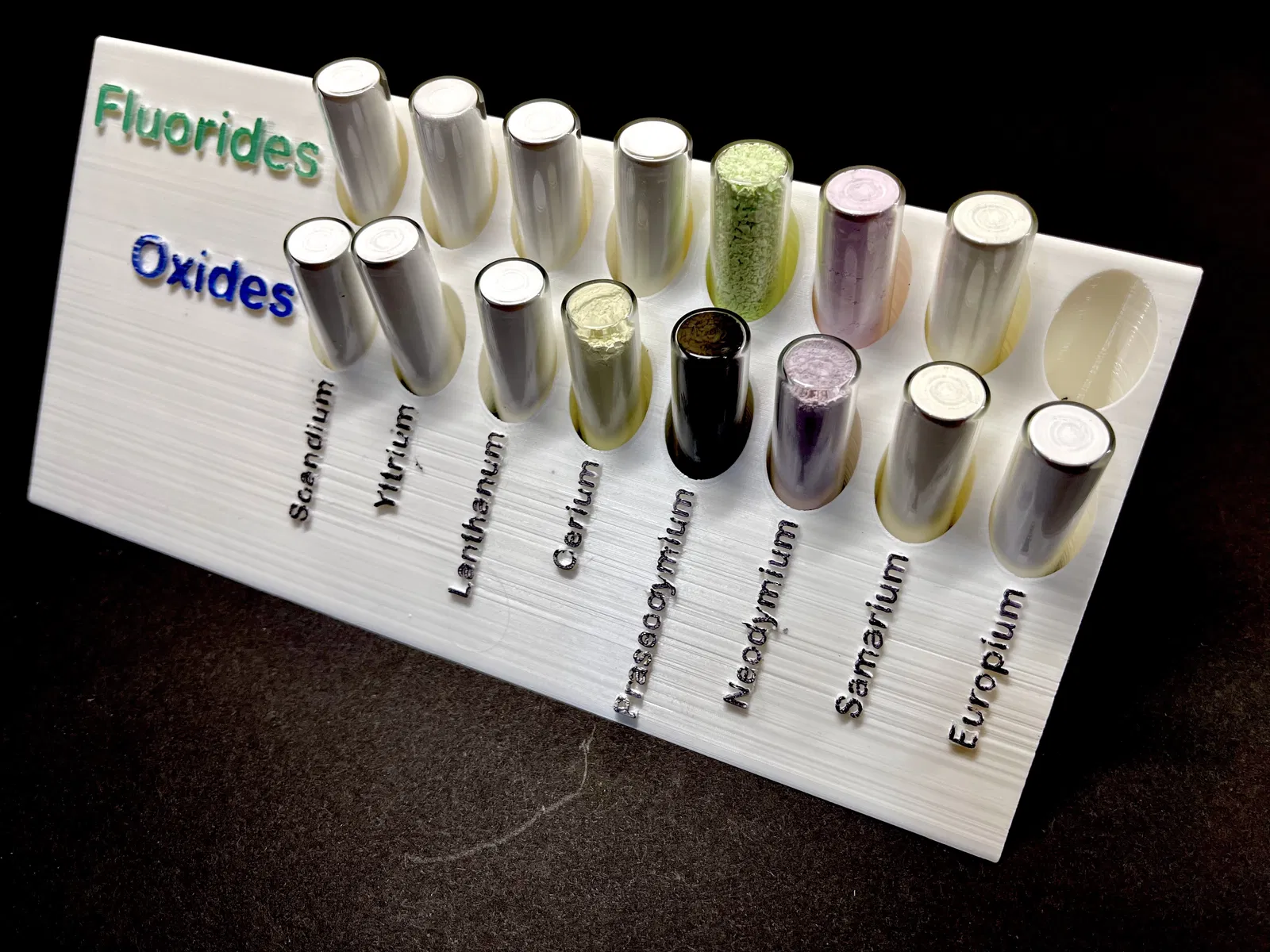 Mô hình trưng bày oxit & florua đất hiếm hoàn chỉnh, bao gồm cả Scandium và Yttrium. Kích thước lỗ vừa với chai đựng mẫu 1 dram (15 x 45 mm).